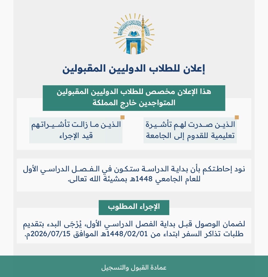 إعلان للطلاب الدوليين المقبولين المتواجدين خارج المملكة بخصوص طلب تذاكر السفر