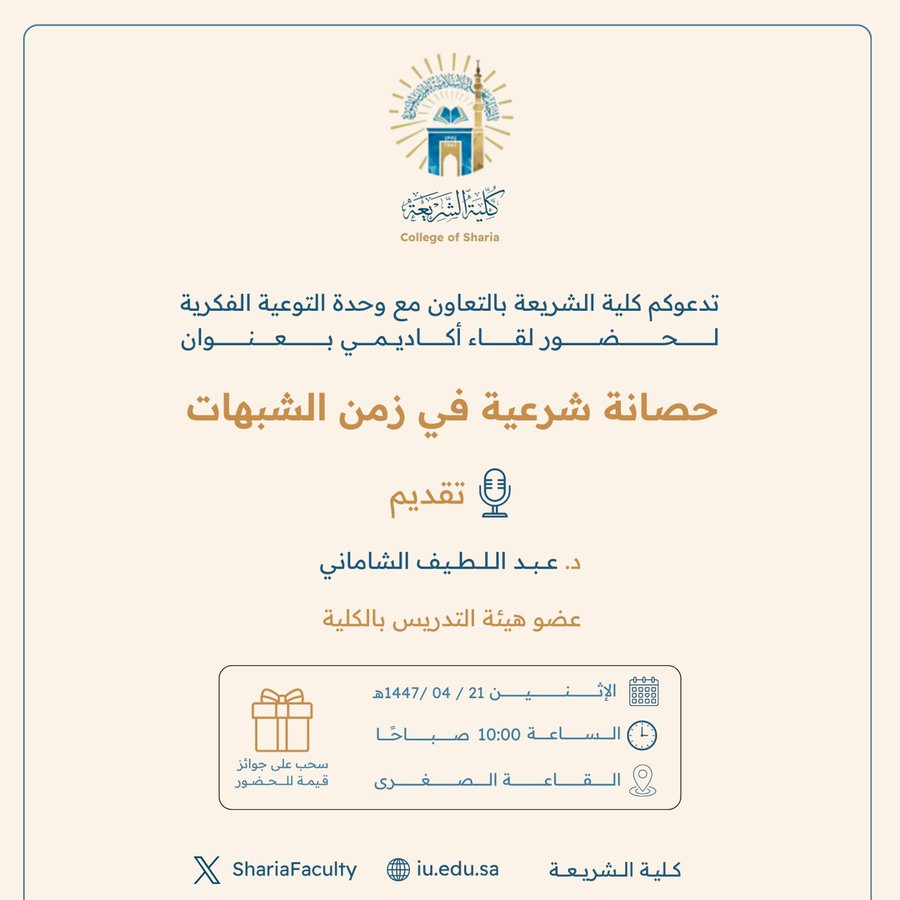 تدعوكم #كلية_الشريعة بالتعاون مع #وحدة_التوعية_الفكرية لحضور لقاء أكاديمي بعنوان: