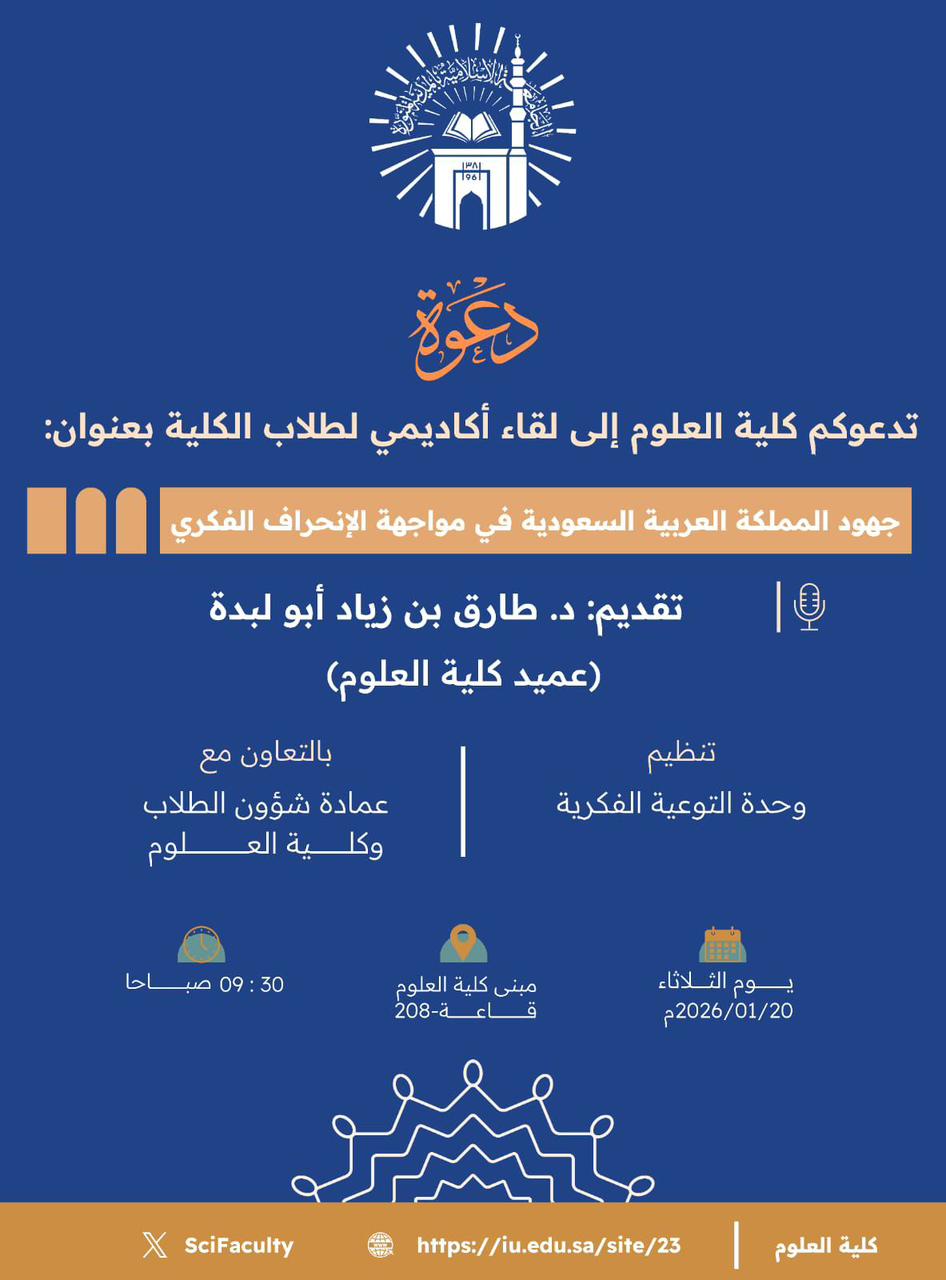 جهود المملكة العربية السعودية في مواجهة الانحراف الفكري بتقديم سعادة عميد كلية العلوم د. طارق بن زياد أبو لبدة