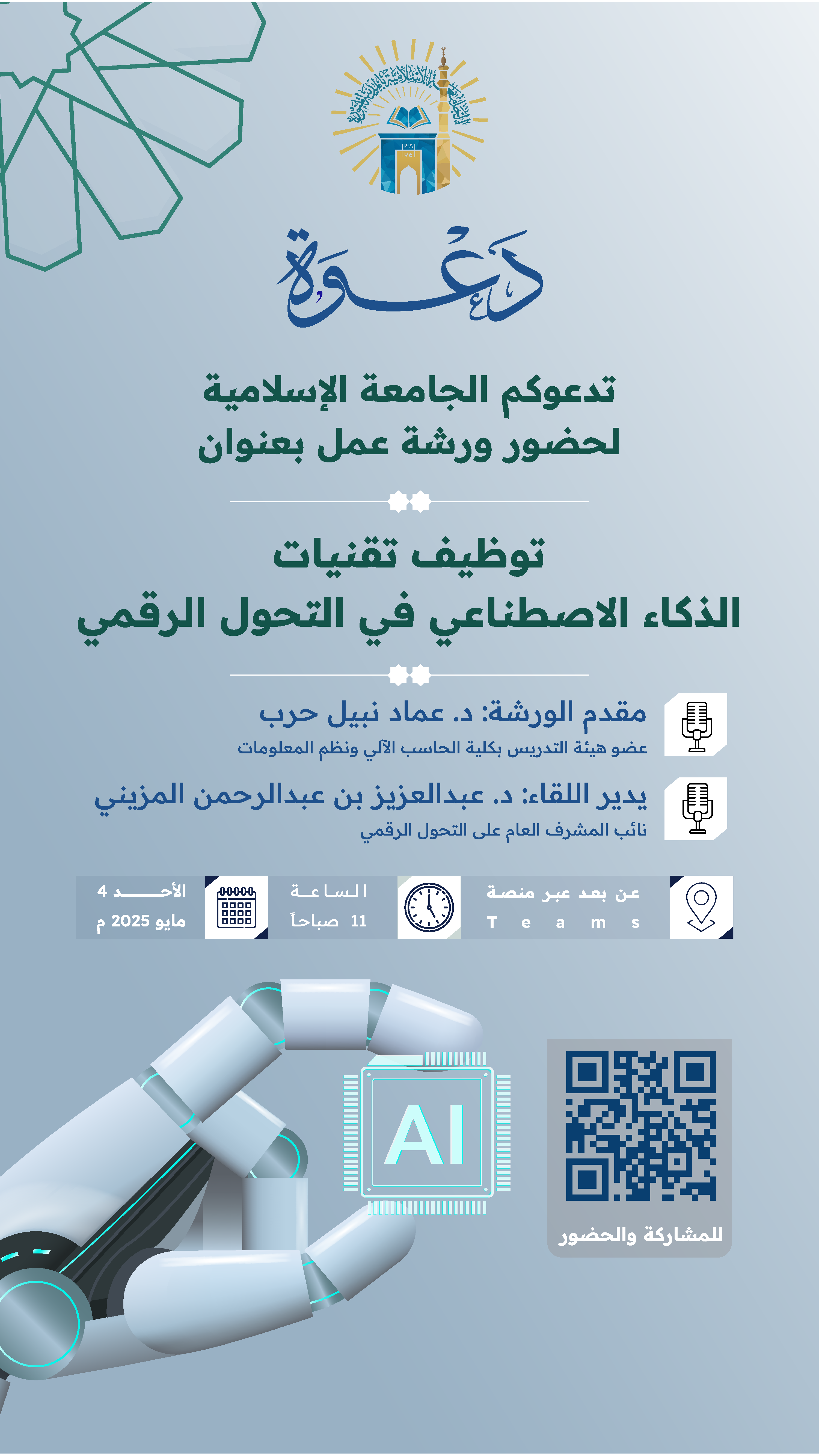 تدعوكم الجامعة الإسلامية لحضور ورشة عمل بعنوان: (توظيف تقنيات الذكاء الاصطناعي في التحول الرقمي)