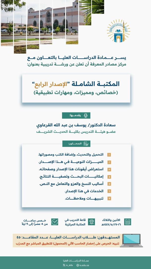 ‏تدعوكم ⁧‫عمادة الدراسات العليا‬⁩ بالتعاون مع ⁧‫مركز مصادر المعرفة‬⁩ ‏لحضور ورشة تدريبية بعنوان: المكتبة الشاملة (الاصدار الرابع) خصائص ومميزات، ومهارات تطبيقية ‏يقدّمها د. يوسف القرعاوي ‏يوم الاثنين والثلاثاء 26-27/ 5/ 1447 ‏الساعة 4 مساءً