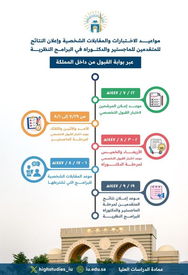 تعلن ⁧‫الجامعة الإسلامية‬⁩ ممثلةً بعمادة الدراسات العليا مواعيد الاختبارات، والمقابلات الشخصية، وإعلان النتائج لبرامج الماجستير والدكتوراه في المسار النظري