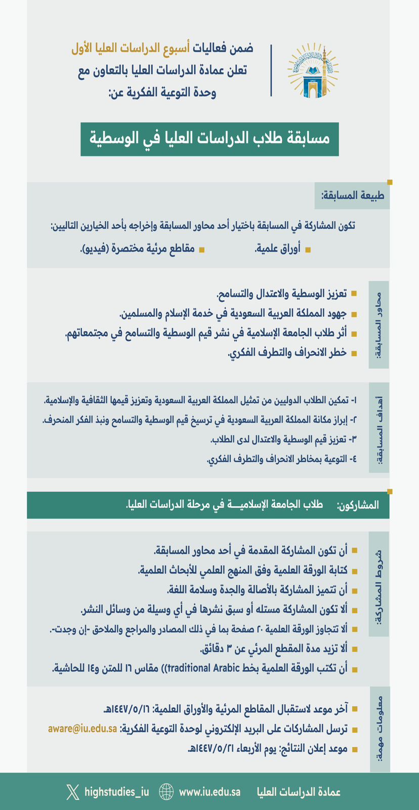 ‏تعلن ⁧عمادة الدراسات العليا‬⁩ بالتعاون مع ⁧‫وحدة التوعية الفكرية‬⁩ ‏ضمن فعاليات ⁧‫أسبوع الدراسات العليا‬⁩ الأول ‏عن إقامة مسابقة طلاب الدراسات العليا في الوسطية