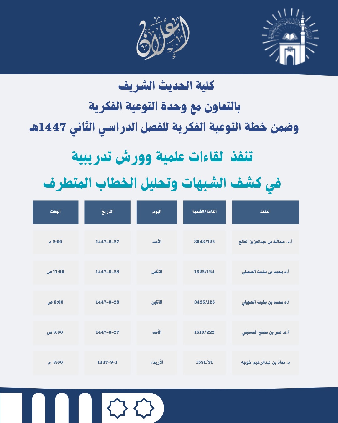 تنفذ كلية الحديث الشريف بالتعاون مع وحدة التوعية الفكرية عدداً من اللقاءات العلمية والورش التدريبية في كشف الشبهات وتحليل الخطاب المتطرف