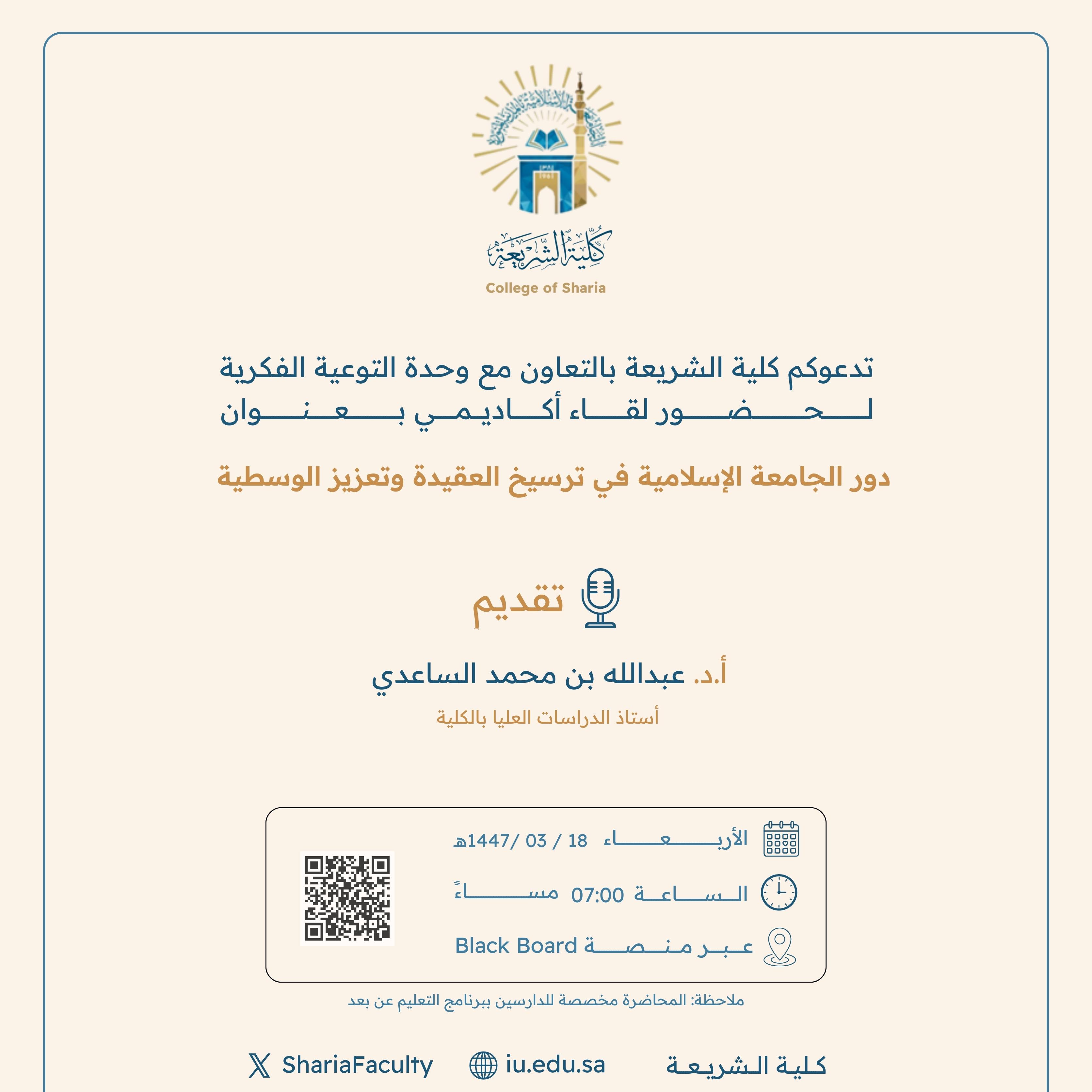 تقيم #كلية_الشريعة بالتعاون مع #وحدة_التوعية_الفكرية لقاء أكاديميًا لطلاب وطالبات برنامج بكالوريوس الشريعة (عن بعد) تحت عنوان: "دور الجامعة الإسلامية في ترسيخ العقيدة وتعزيز الوسطية" يلقيه أ.د. عبد الله بن محمد الساعدي • يوم الأربعاء ١٨-٣-١٤٤٧هـ • الساعة ٧:٠٠ مساءً • عبر منصة (Black board)