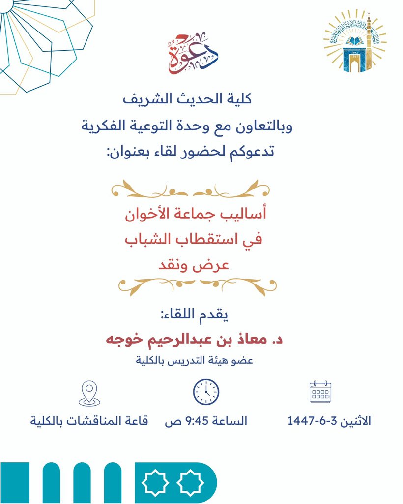 تنفيذ لقاء توعوي لطلاب كلية الحديث الشريف بالتعاون مع وحدة التوعية الفكرية يوم الاثنين 03-جمادى الآخرة-1447