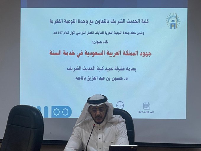 تنفيذ لقاء توعوي لطلاب كلية الحديث الشريف بالتعاون مع وحدة التوعية الفكرية يوم الأحد 20-ربيع الثاني-1447