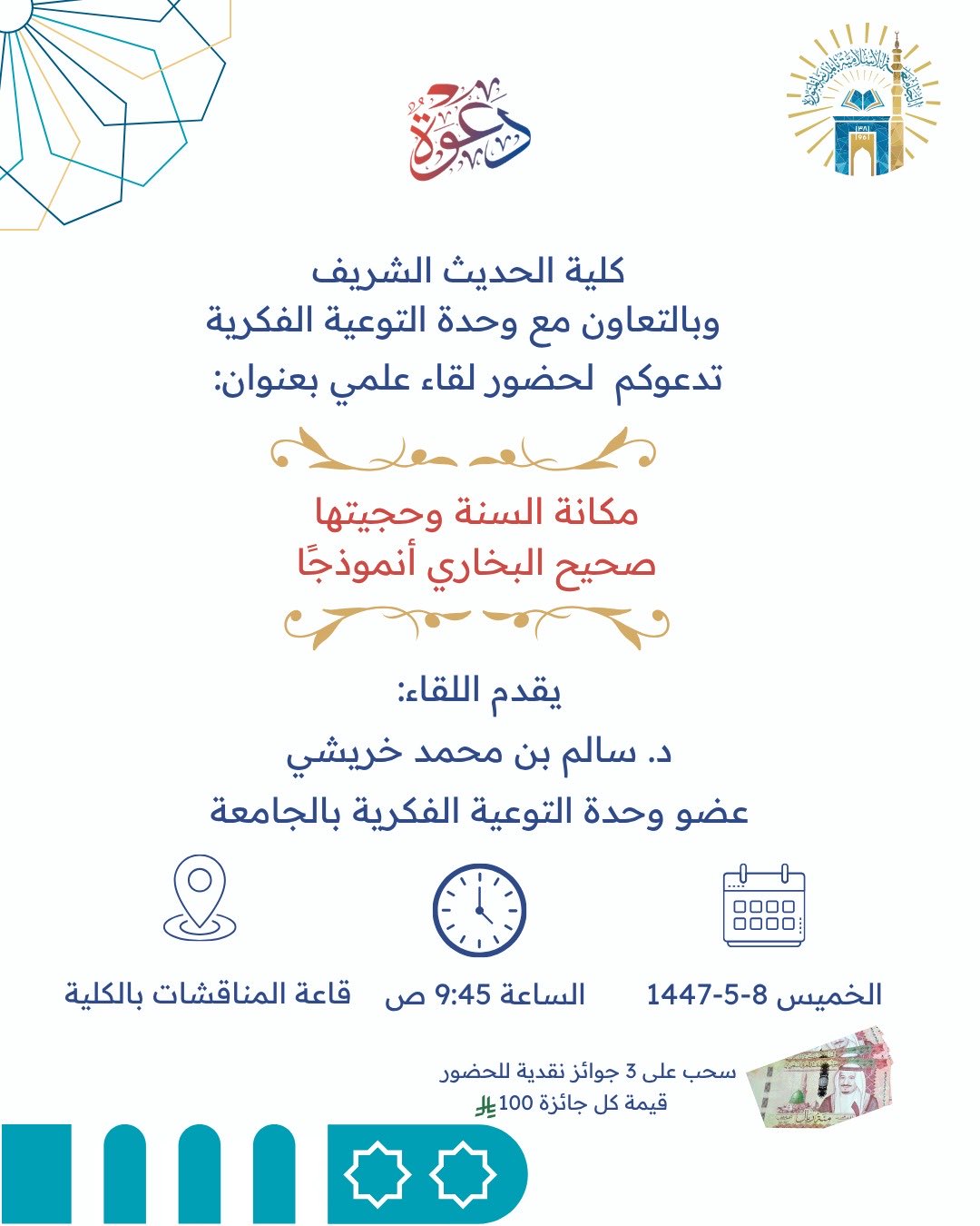 تنفيذ لقاء توعوي لطلاب كلية الحديث الشريف بالتعاون مع وحدة التوعية الفكرية يوم الخميس 08-جمادى الأولى-1447
