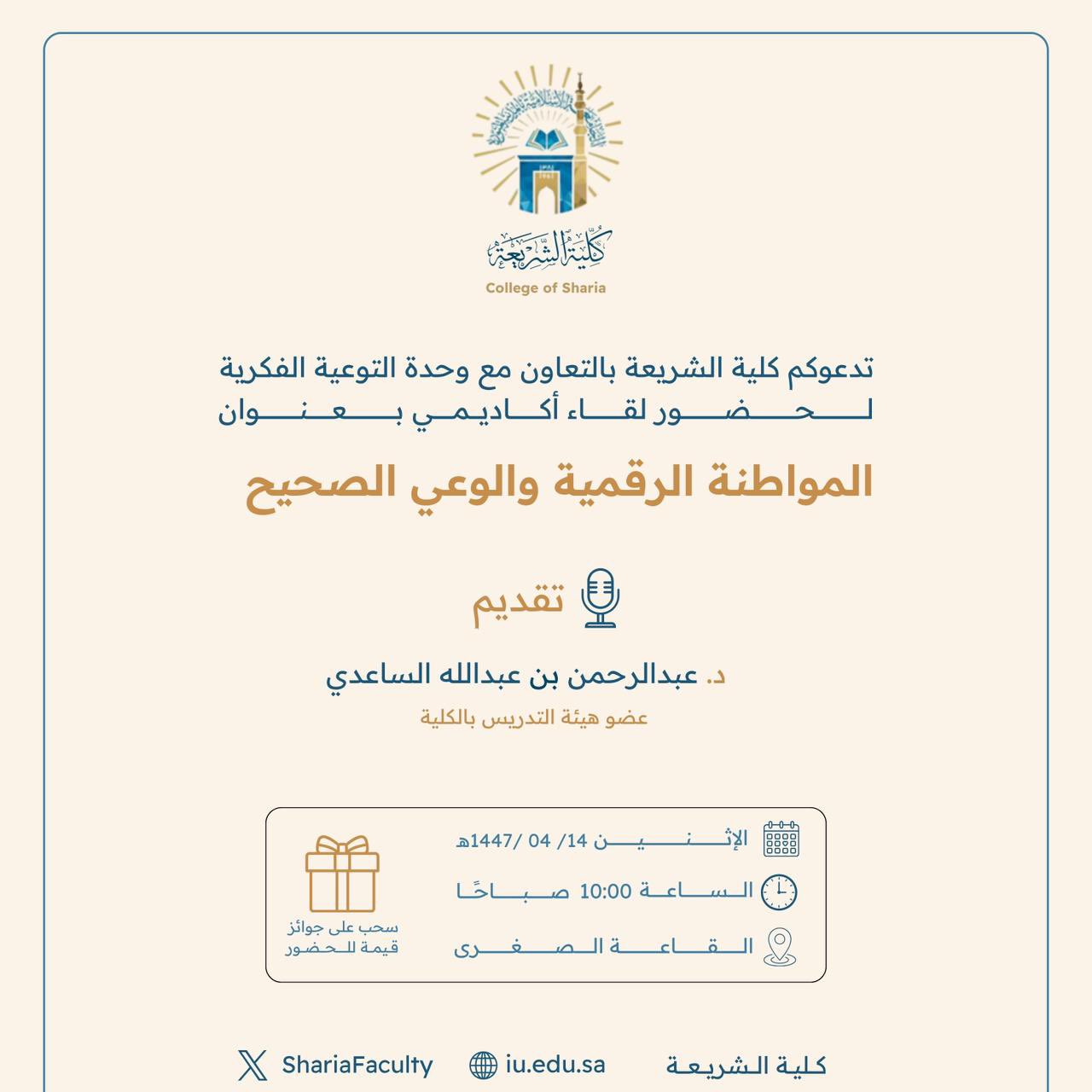 تنفيذ لقاء توعوي لطلاب كلية الشريعة بالتعاون مع وحدة التوعية الفكرية يوم الاثنين 14-ربيع الثاني-1447