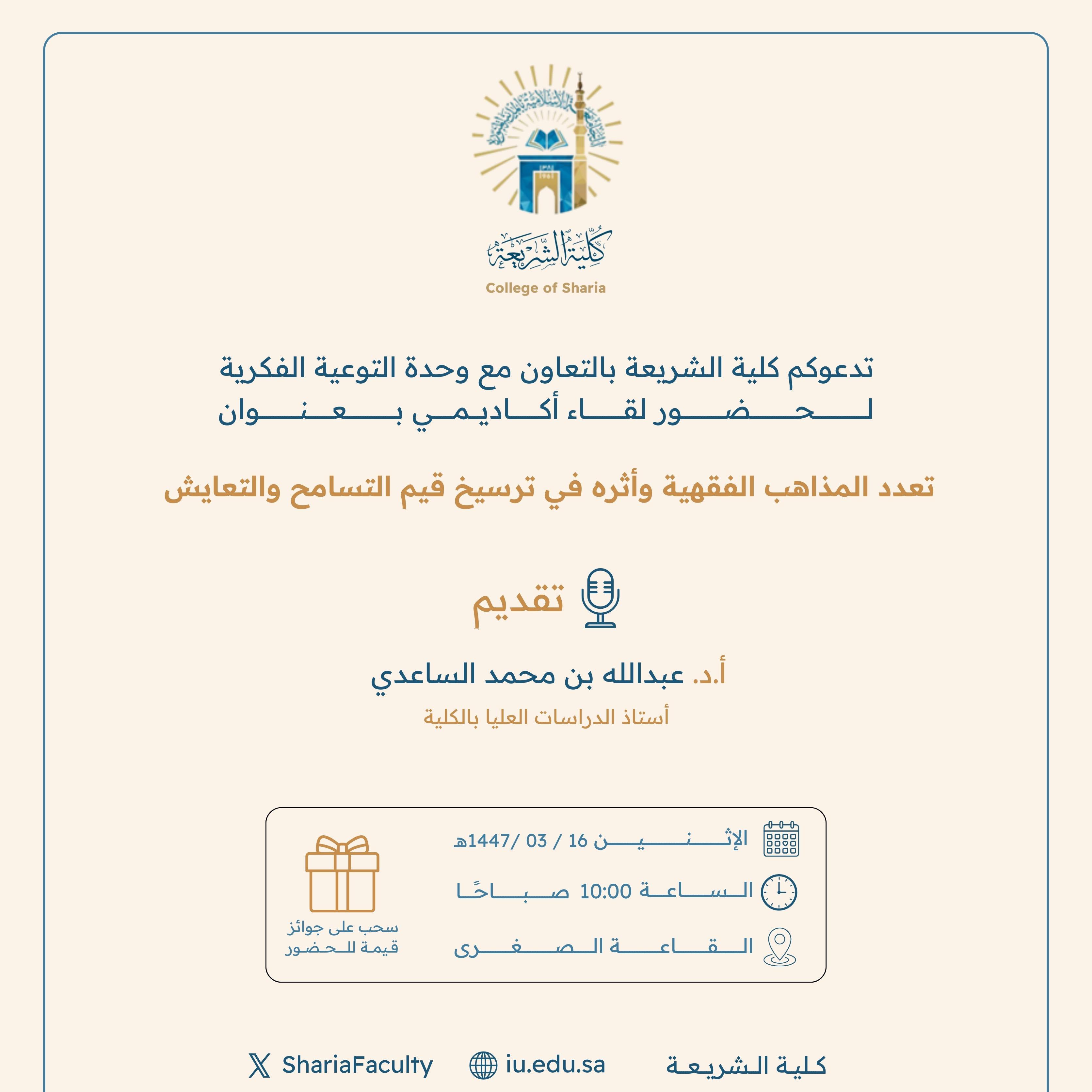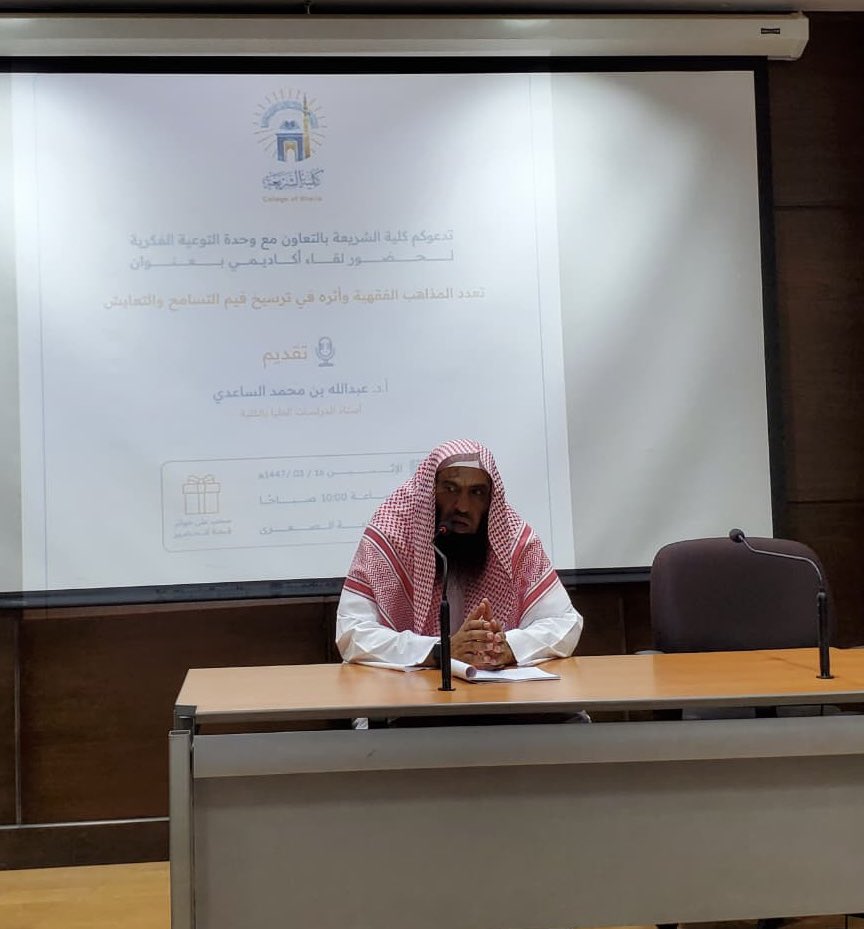 تنفيذ لقاء توعوي لطلاب كلية الشريعة بالتعاون مع وحدة التوعية الفكرية يوم الاثنين 16-ربيع الأول-1447
