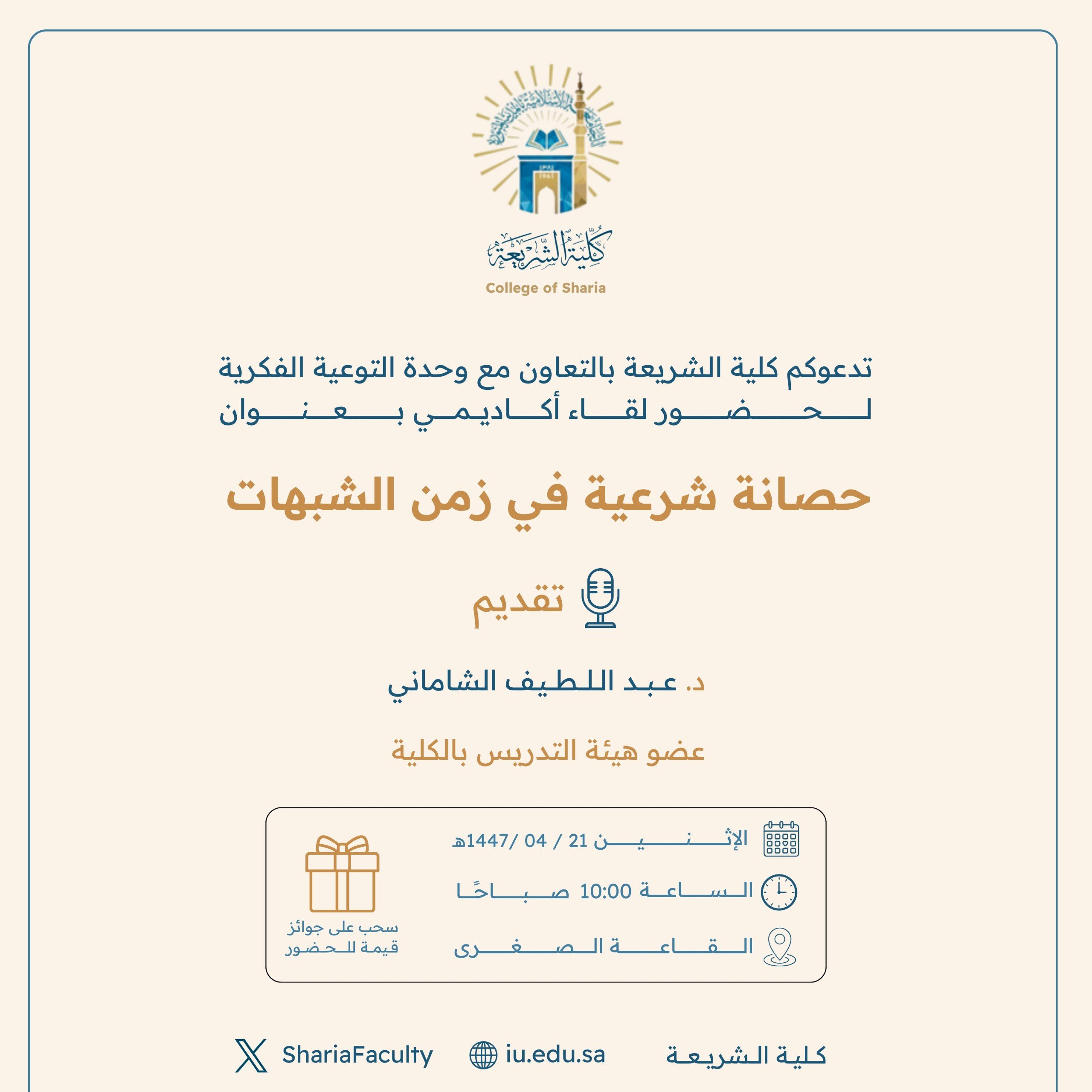 تنفيذ لقاء توعوي لطلاب كلية الشريعة بالتعاون مع وحدة التوعية الفكرية يوم الاثنين 21-ربيع الثاني-1447