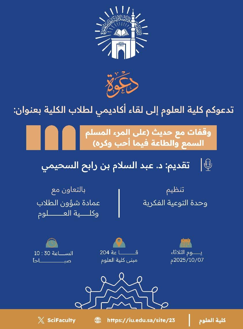 تنفيذ لقاء توعوي لطلاب كلية العلوم بالتعاون مع وحدة التوعية الفكرية يوم الثلاثاء 15-ربيع الثاني-1447