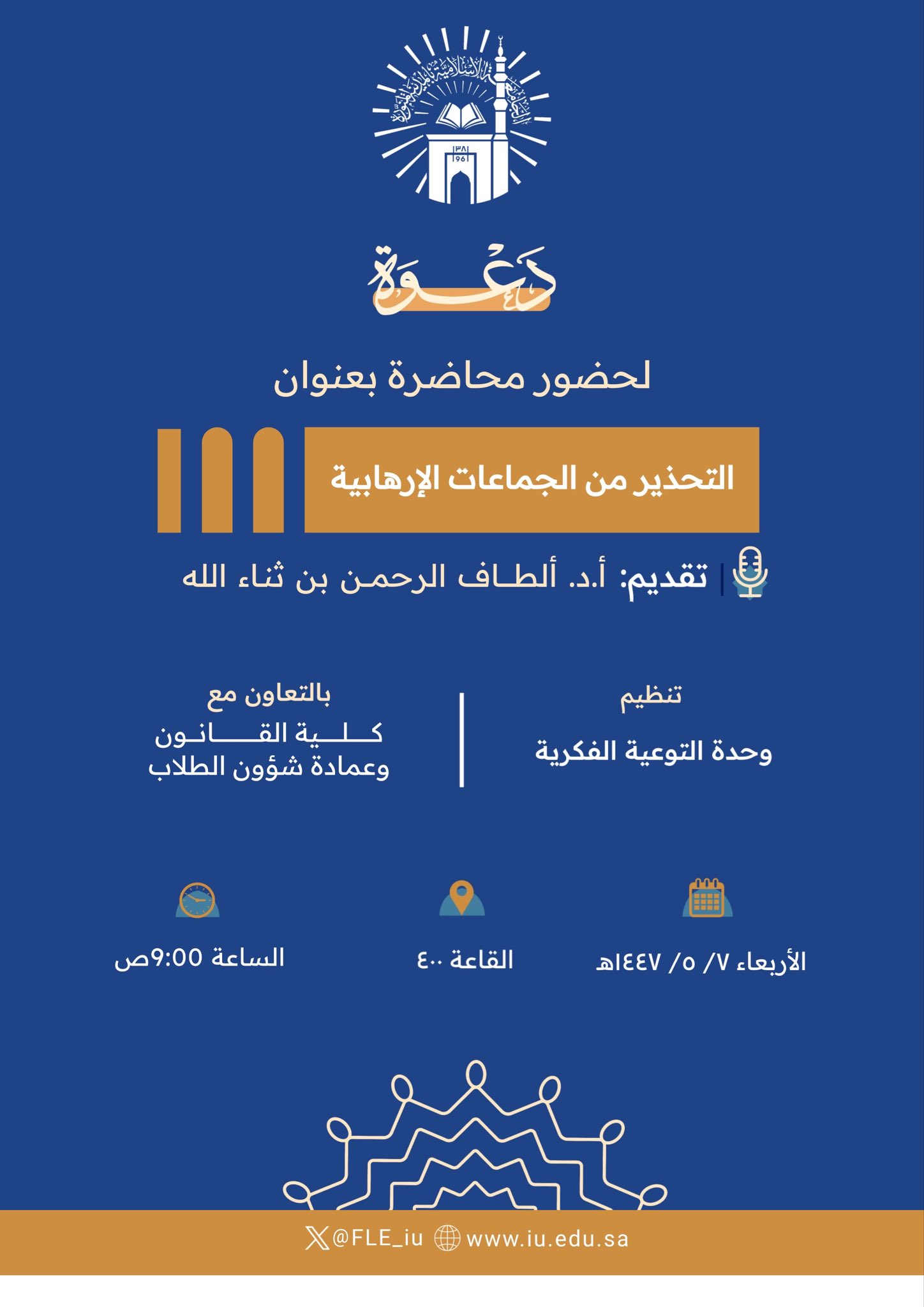 تنفيذ لقاء توعوي لطلاب كلية القانون بالتعاون مع وحدة التوعية الفكرية يوم الأربعاء 07-جمادى الأولى-1447