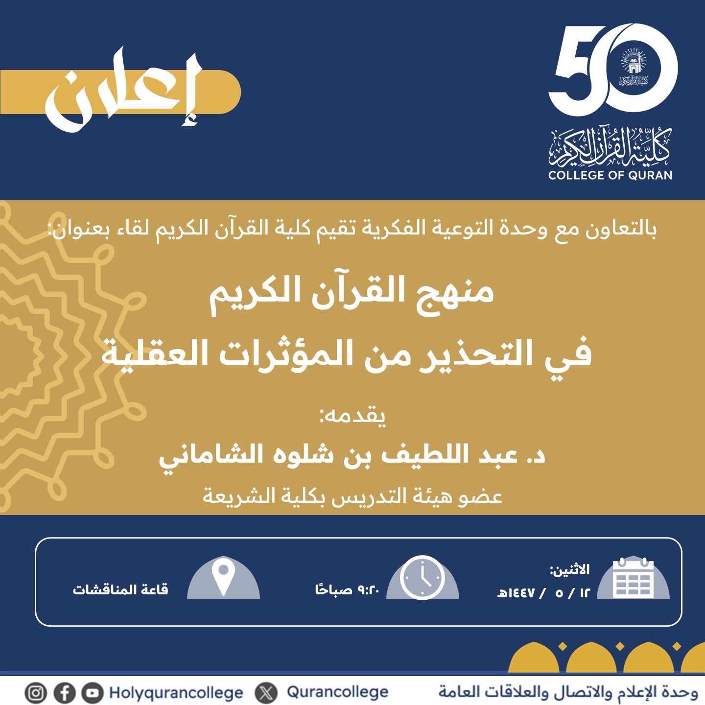 تنفيذ لقاء توعوي لطلاب كلية القرآن الكريم بالتعاون مع وحدة التوعية الفكرية يوم الاثنين 12-جمادى الأولى-1447