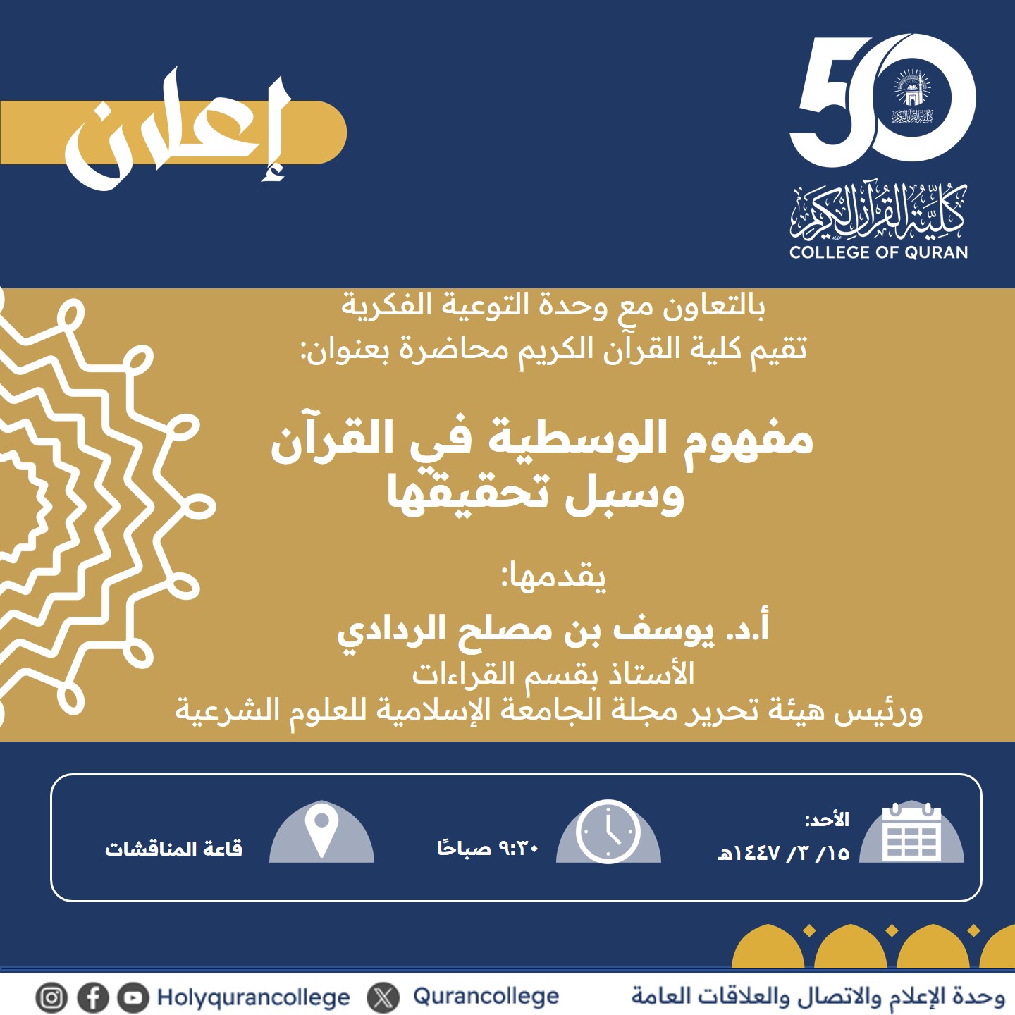 تنفيذ لقاء توعوي لطلاب كلية القرآن الكريم بالتعاون مع وحدة التوعية الفكرية يوم الأحد 15-ربيع الأول-1447