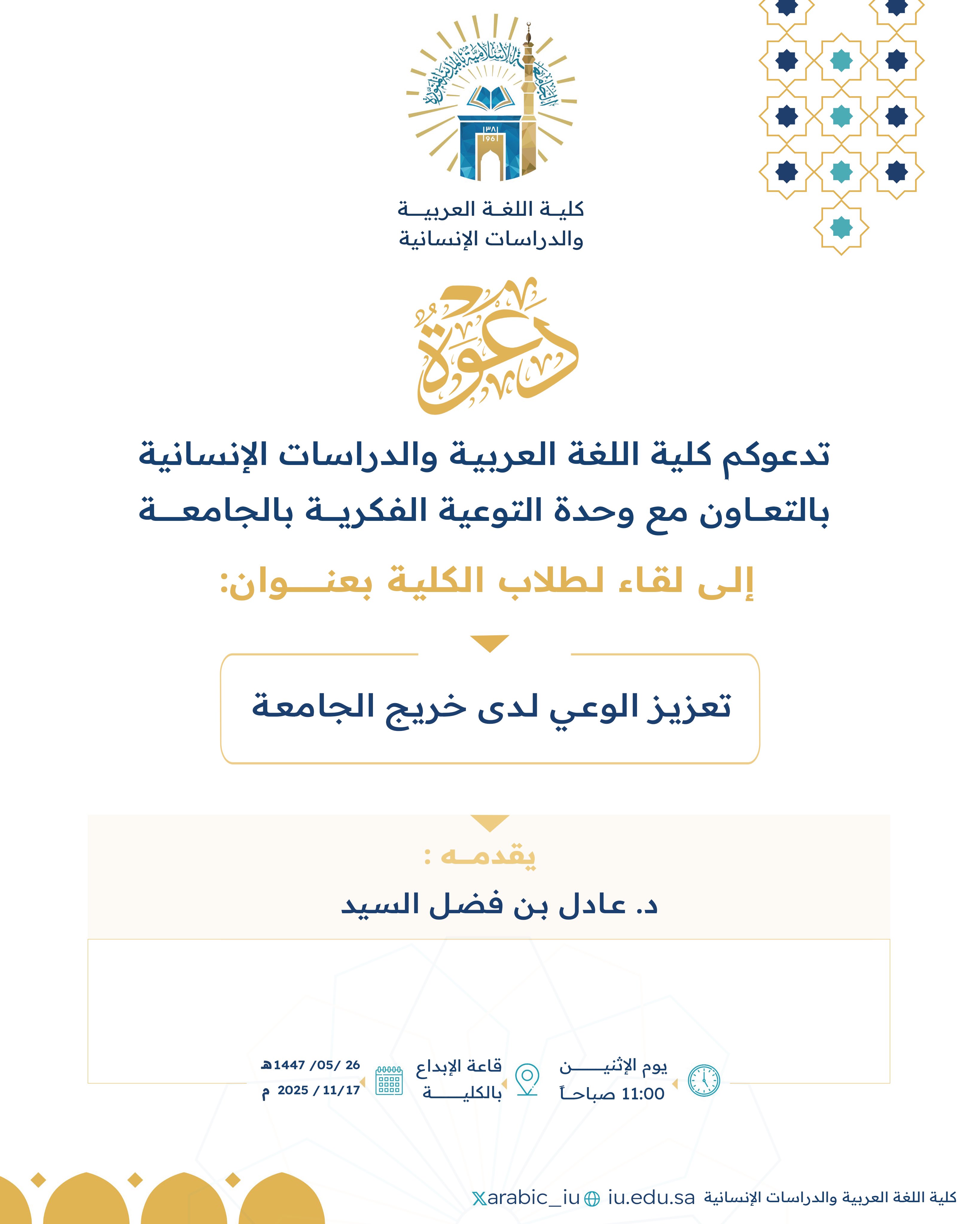 تنفيذ لقاء توعوي لطلاب كلية اللغة العربية بالتعاون مع وحدة التوعية الفكرية يوم الاثنين 19-جمادى الأولى-1447