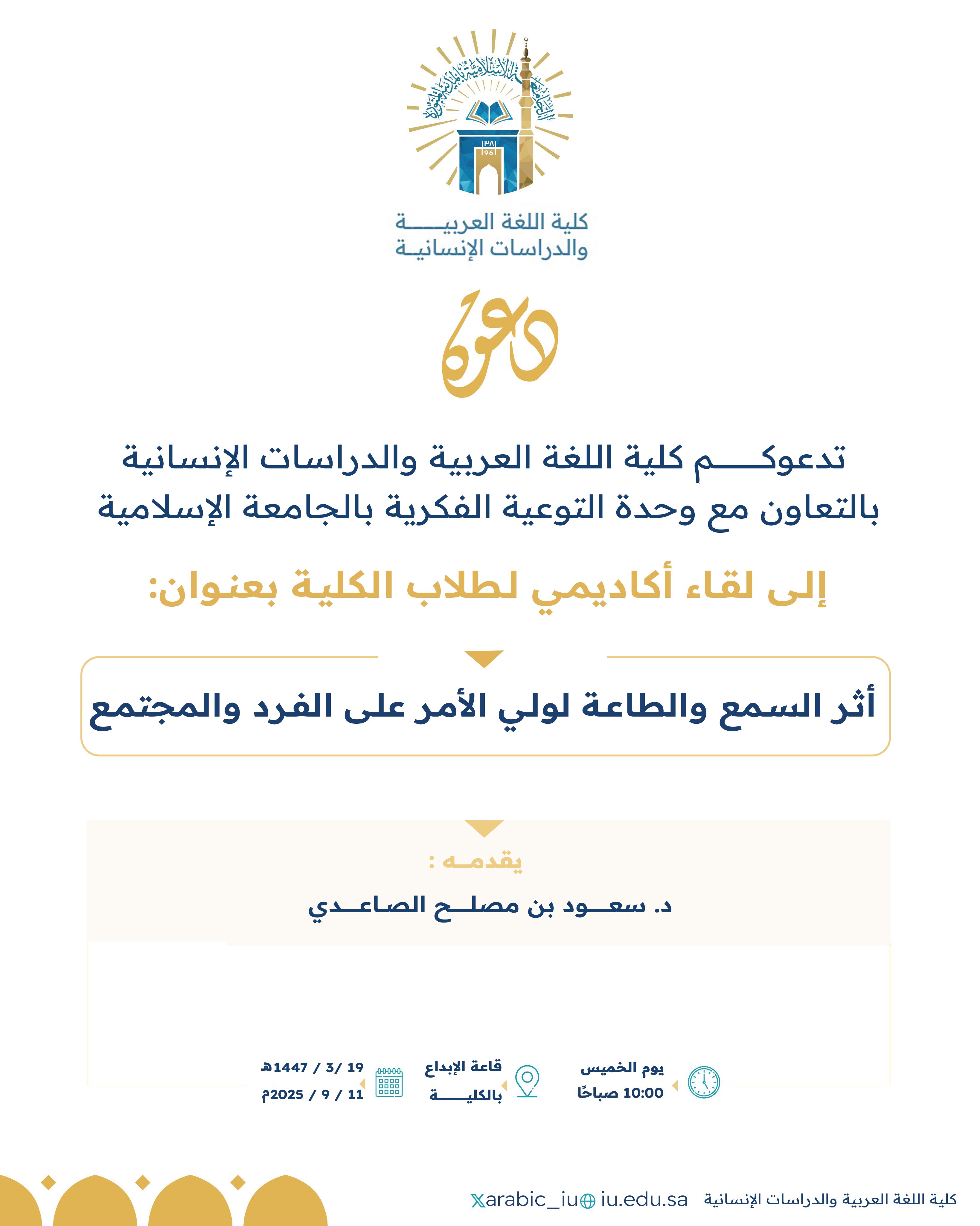 تنفيذ لقاء توعوي لطلاب كلية اللغة العربية والدراسات الإنسانية بالتعاون مع وحدة التوعية الفكرية يوم الخميس 19-ربيع الأول-1447
