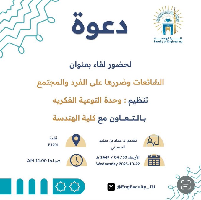 تنفيذ لقاء توعوي لطلاب كلية الهندسة بالتعاون مع وحدة التوعية الفكرية يوم الأربعاء 30-ربيع الثاني-1447