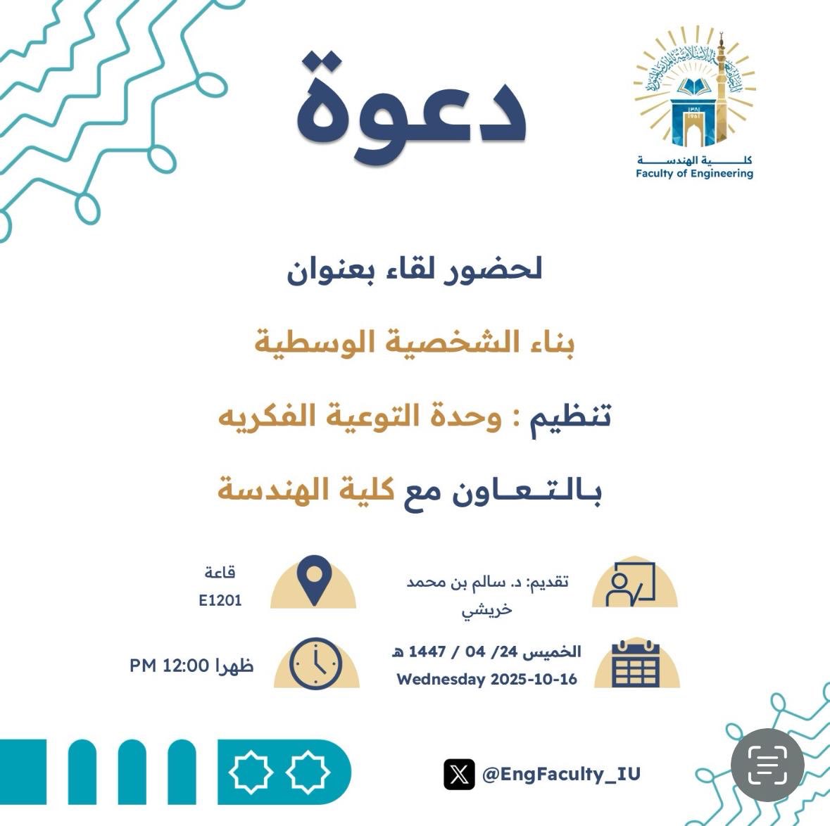 تنفيذ لقاء توعوي لطلاب كلية الهندسة بالتعاون مع وحدة التوعية الفكرية يوم الخميس 24-ربيع الثاني-1447