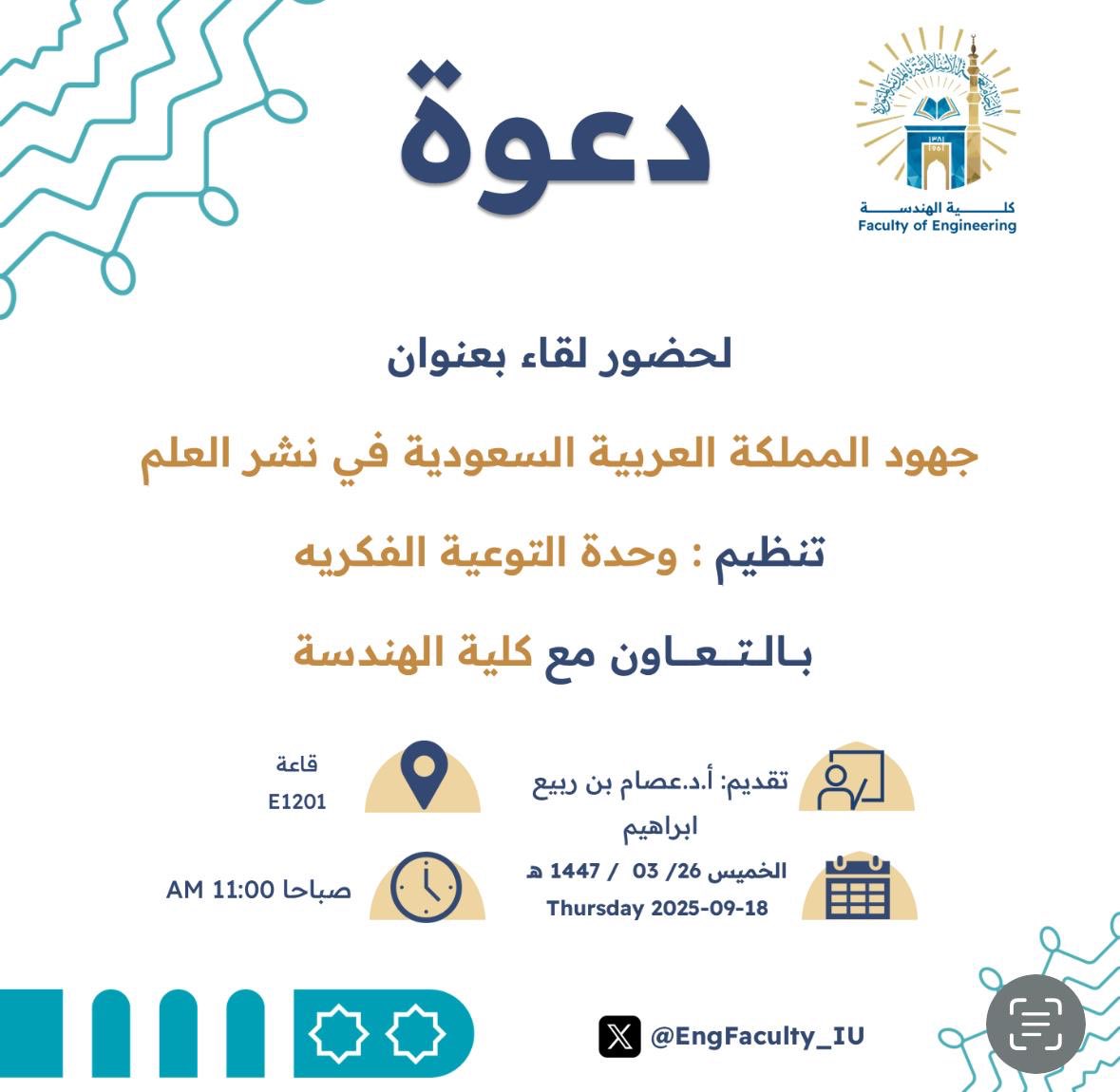 تنفيذ لقاء توعوي لطلاب كلية الهندسة بالتعاون مع وحدة التوعية الفكرية يوم الخميس 26-ربيع الأول-1447