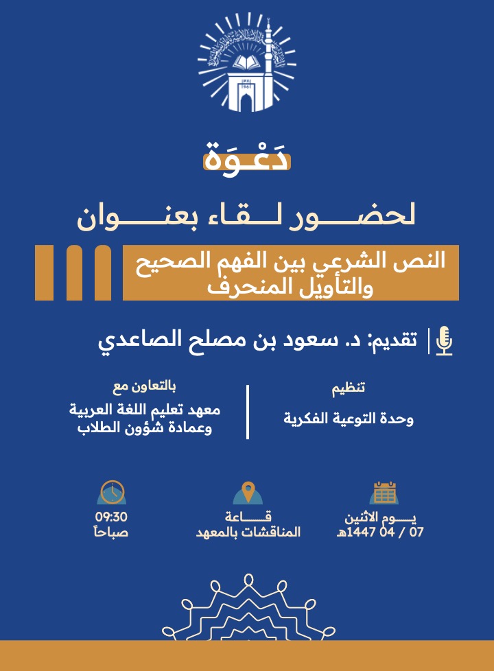 تنفيذ لقاء توعوي لطلاب معهد تعليم اللغة العربية بالتعاون مع وحدة التوعية الفكرية يوم الاثنين 07-ربيع الثاني-1447