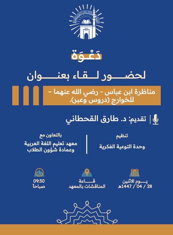 تنفيذ لقاء توعوي لطلاب معهد تعليم اللغة العربية بالتعاون مع وحدة التوعية الفكرية يوم الاثنين 28-ربيع الثاني-1447