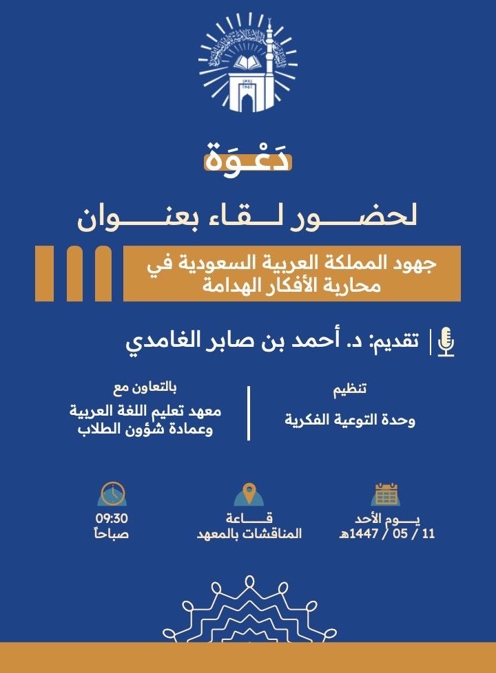 تنفيذ لقاء توعوي لطلاب معهد تعليم اللغة العربية بالتعاون مع وحدة التوعية الفكرية يوم الأحد 11-جمادى الأولى-1447