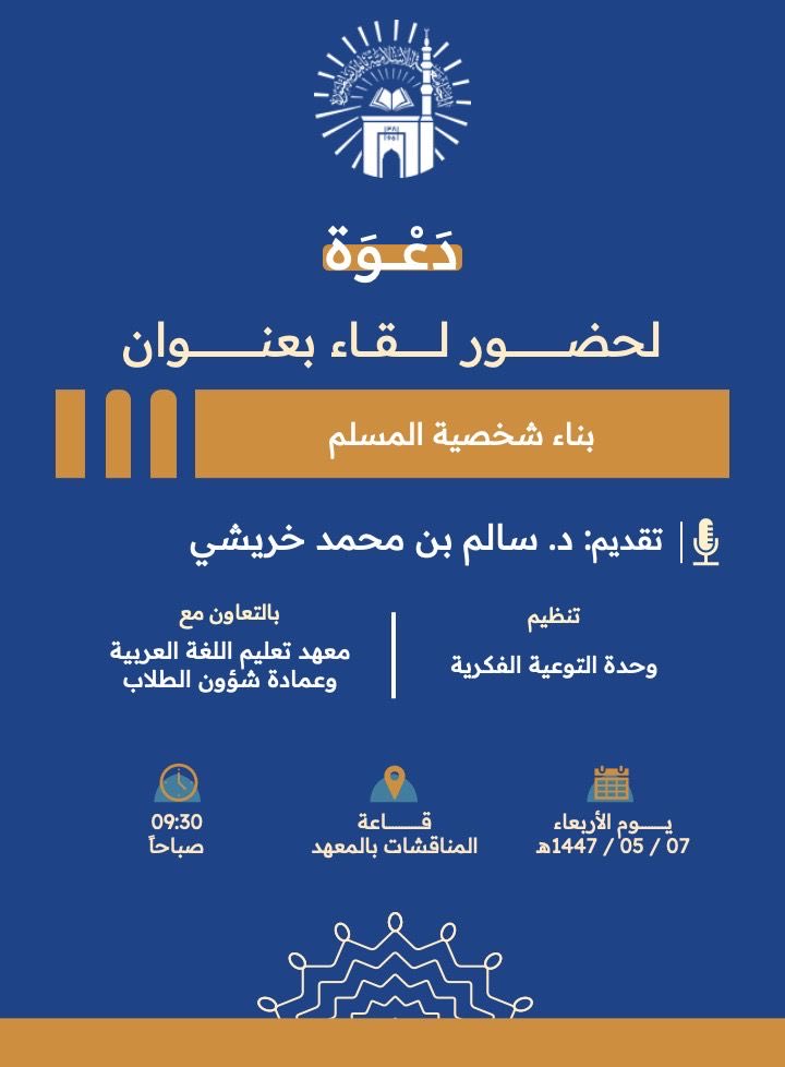 تنفيذ لقاء توعوي لطلاب معهد تعليم اللغة العربية بالتعاون مع وحدة التوعية الفكرية يوم الأربعاء 07-جمادى الأولى-1447
