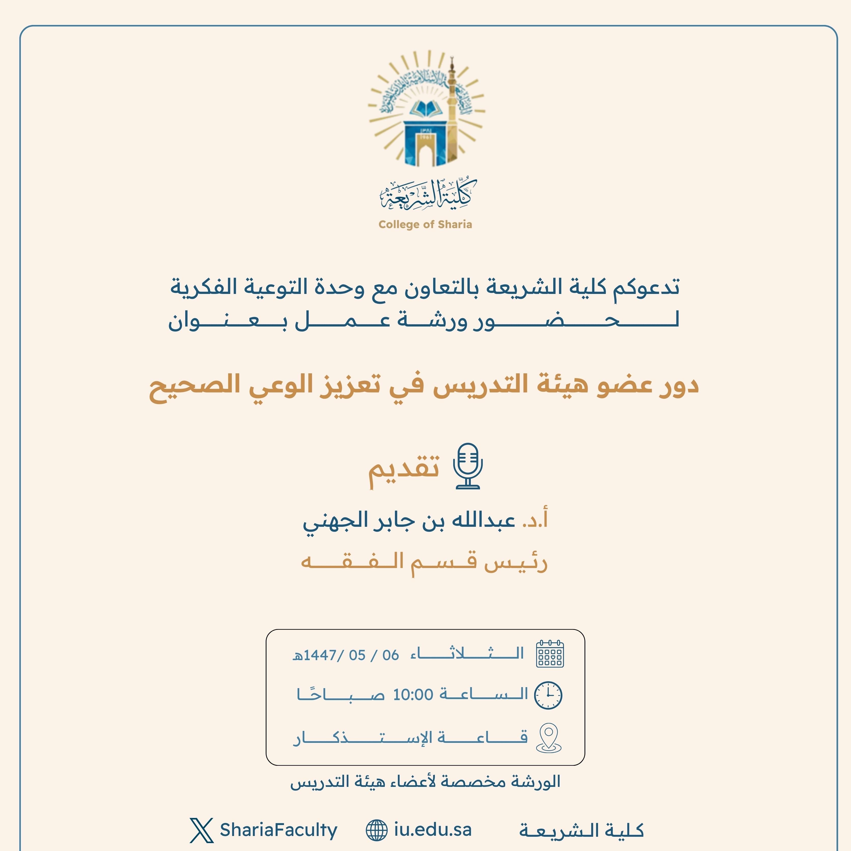 تنفيذ ورشة عمل توعوية لمنسوبي كلية الشريعة بالتعاون مع وحدة التوعية الفكرية يوم الثلاثاء 06-جمادى الأولى-1447