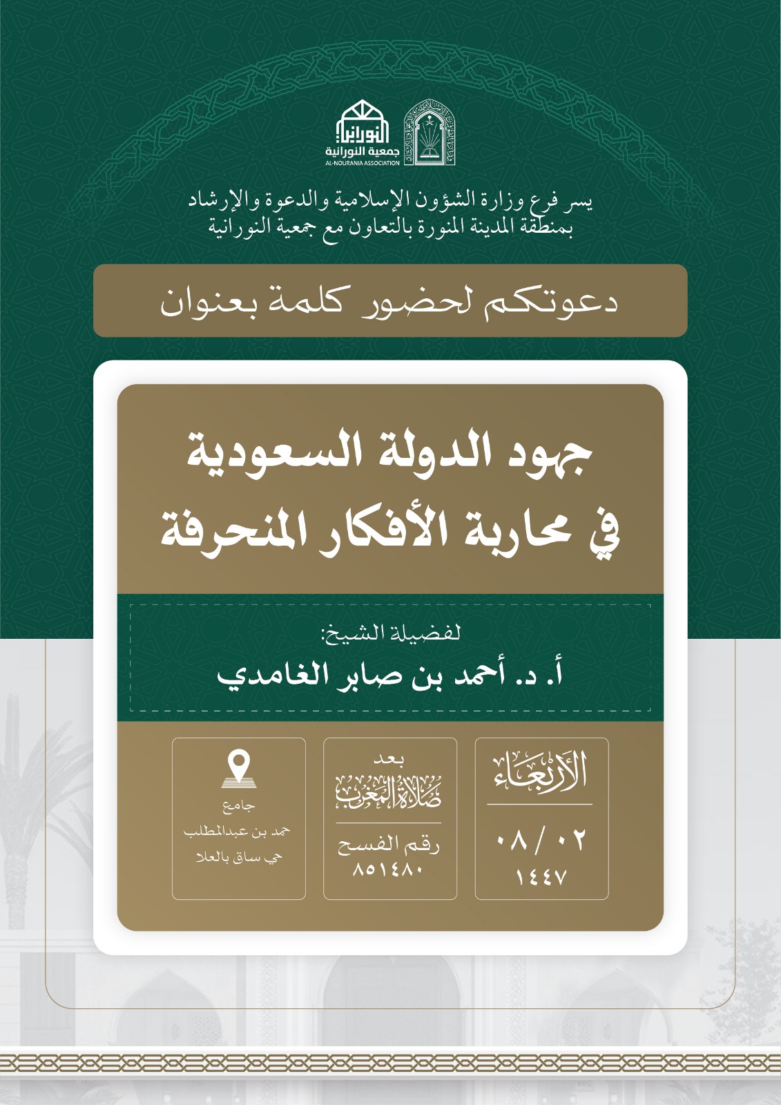 تنفيذ 10 محاضرات في البرنامج الدعوي لمحافظة العلا قدمها فضيلة الدكتور أحمد بن صابر الغامدي