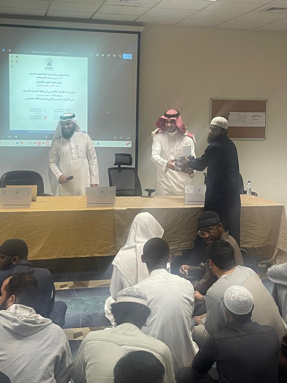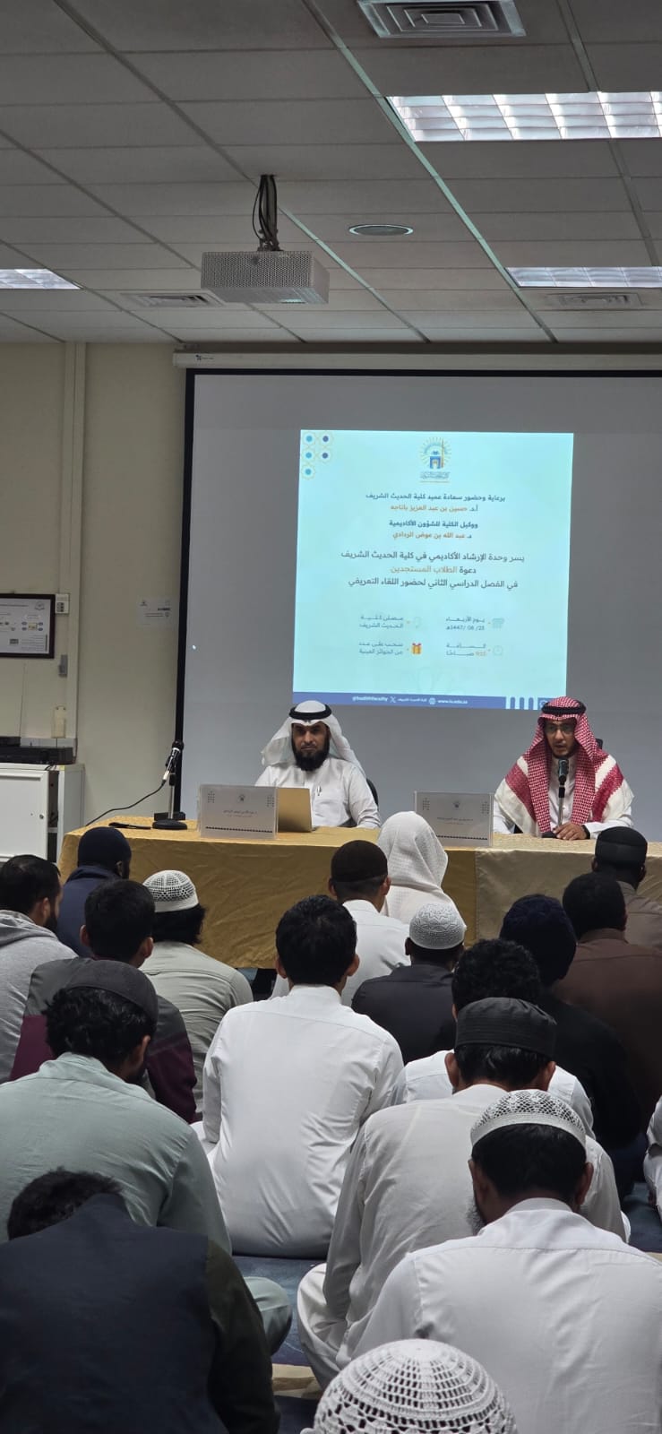 أقامت وحدة الإرشاد الأكاديمي بكلية الحديث الشريف في يوم الأربعاء ٢٣-٨-١٤٤٧هـ لقاءات تعريفية للطلاب المستجدين في الفصل الدراسي الثاني.