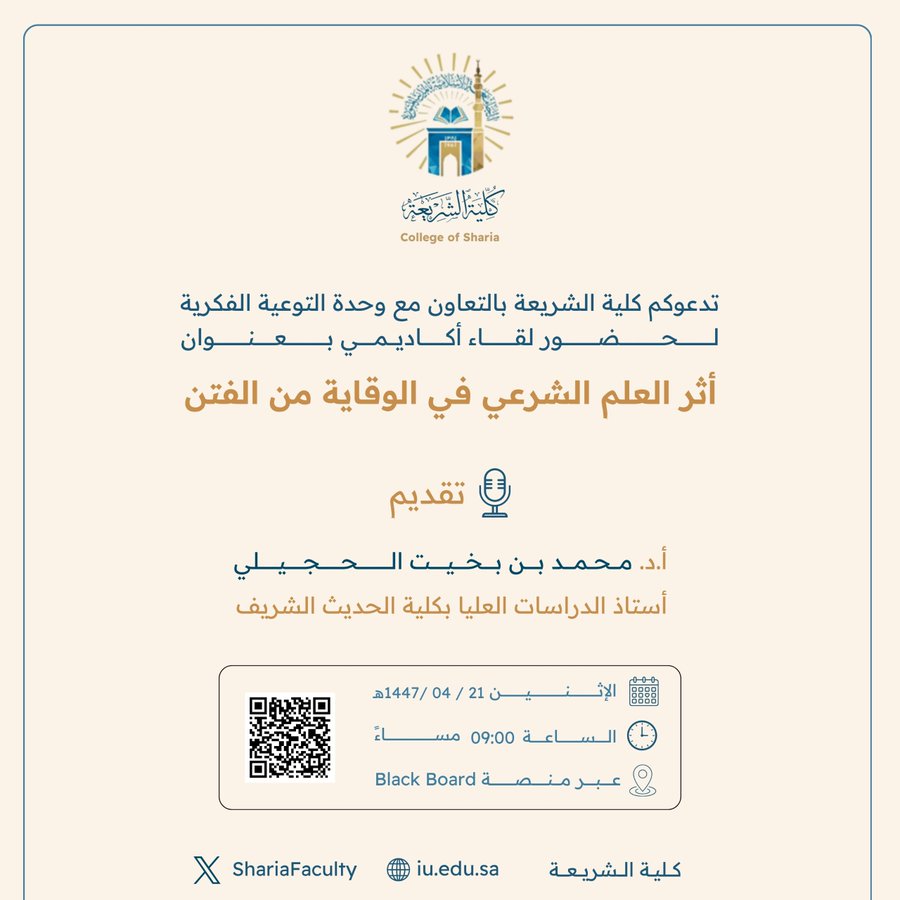 تقيم #كلية_الشريعة بالتعاون مع #وحدة_التوعية_الفكرية لقاء أكاديميًا لطلاب وطالبات برنامج بكالوريوس الشريعة (عن بعد) تحت عنوان: "أثر العلم الشرعي في الوقاية من الفتن" يلقيه أ.د. محمد بن بخيت الحجيلي أستاذ الدراسات العليا بكلية الحديث الشريف • يوم الاثنين ٢١-٤-١٤٤٧هـ • الساعة ٩:٠٠ مساءً • عبر منصة (Black board)