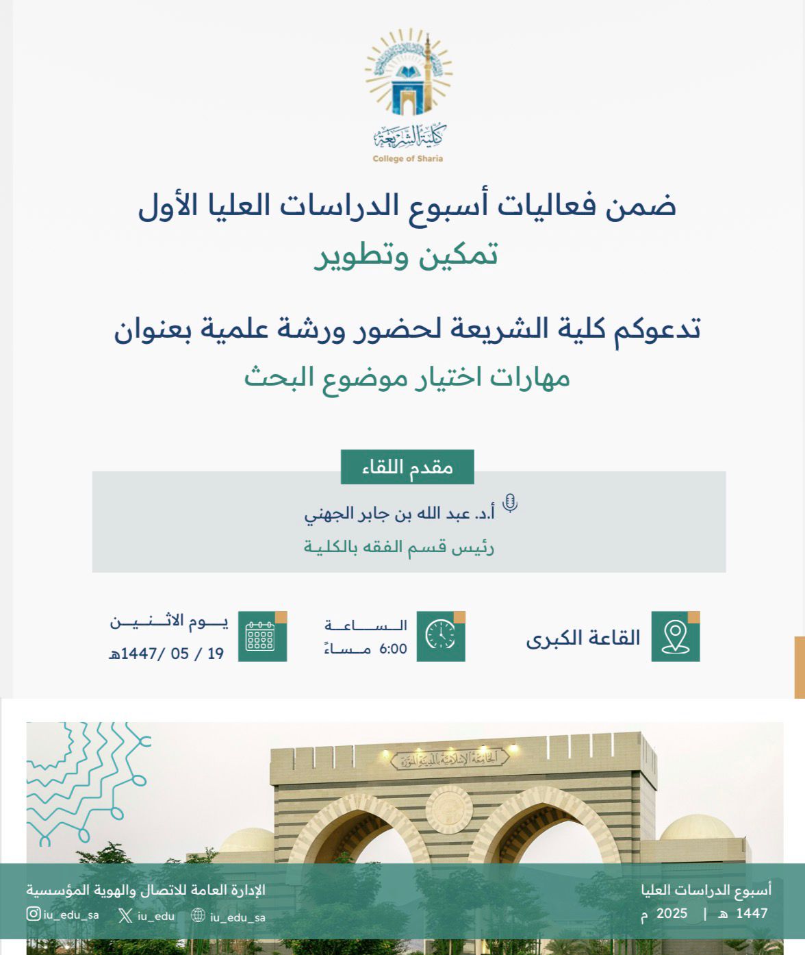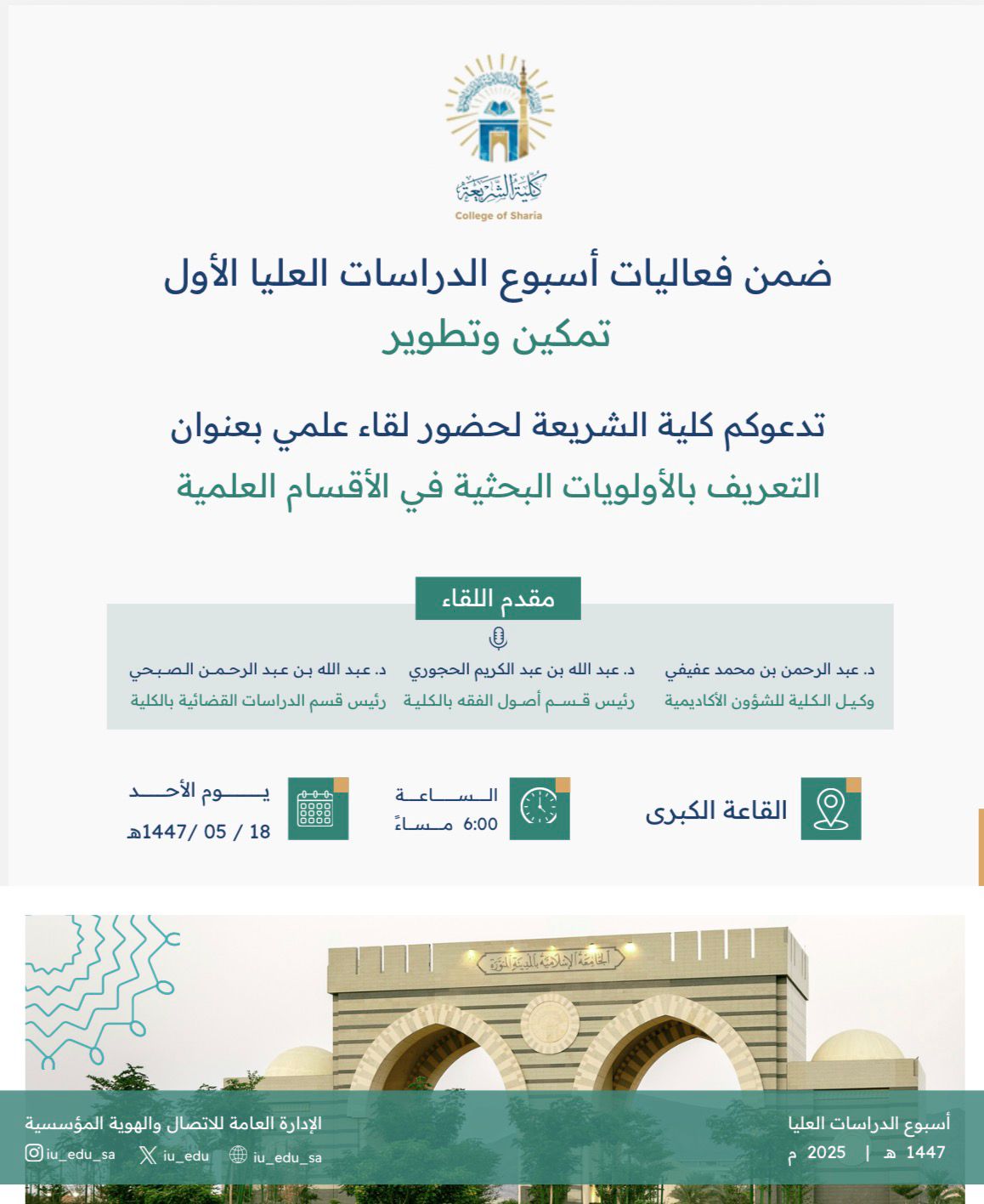 بمناسبة #أسبوع_الدراسات_العليا الأول تحت شعار (#تمكين_وتطوير) تُقيم #كلية_الشريعة بالتعاون مع #عمادة_الدراسات_العليا مجموعة من الفعاليات المتنوعة، ابتداءً من يوم الأحد الموافق ١٨-٥-١٤٤٧هـ وحتى يوم الأربعاء الموافق ٢١-٥-١٤٤٧هـ. وتدعو الكلية أعضاء هيئة التدريس وطلاب الدراسات العليا لحضور هذه الفعاليات والمشاركة لتحقيق أهداف الفعاليات وتنمية المهارات العلمية والبحثية. #الجامعة_الإسلامية