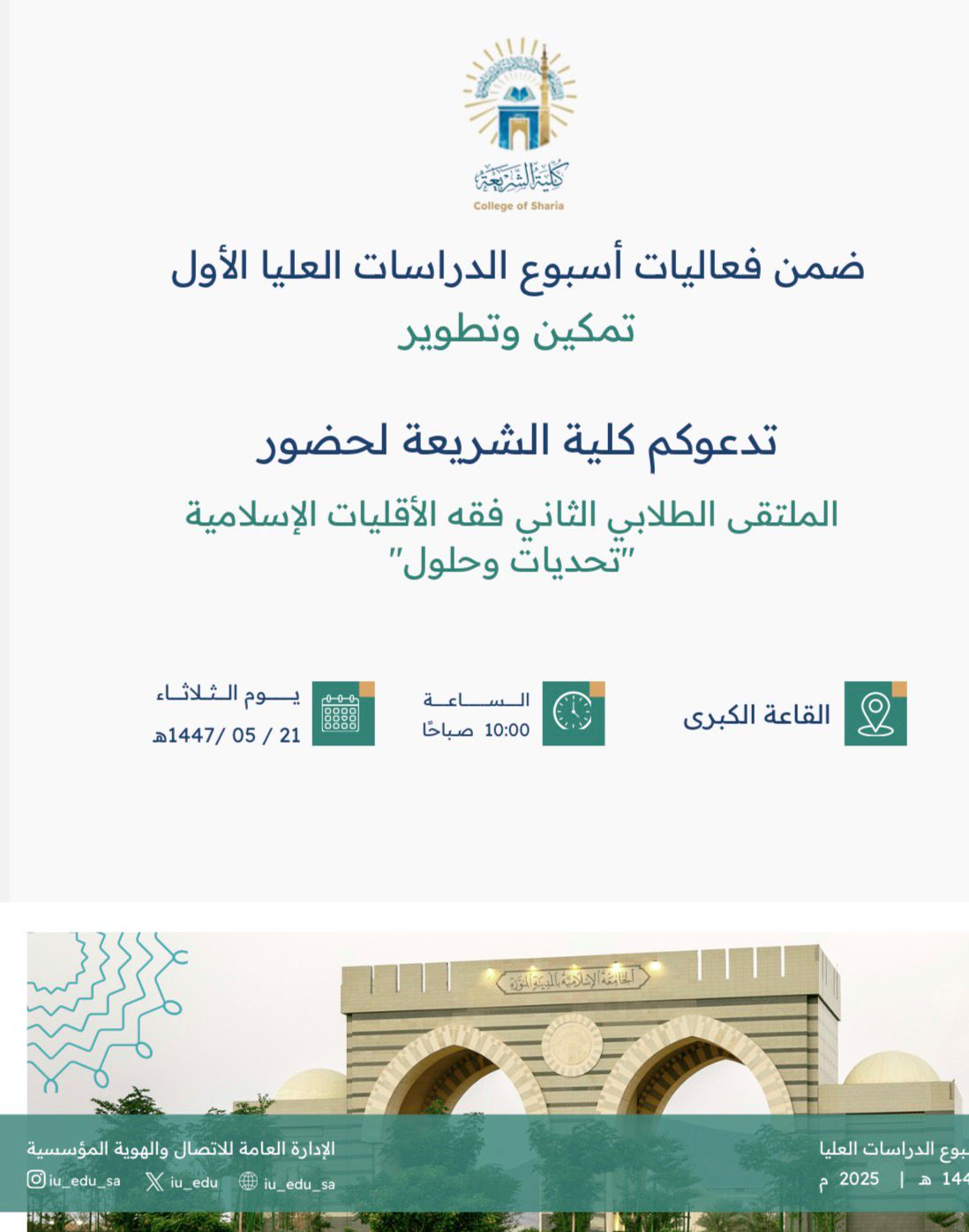 #دعوة تدعوكم #كلية_الشريعة بالتعاون مع #عمادة_الدراسات_العليا لحضور الملتقى الطلابي الثاني ضمن فعاليات #أسبوع_الدراسات_العليا الأول تحت عنوان (تحديات وحلول) * يوم الثلاثاء ٢١-٥-١٤٤٧هـ * الساعة ١٠:٠٠ صباحًا * القاعة الكبرى #الجامعة_الإسلامية #تمكين_وتطوير