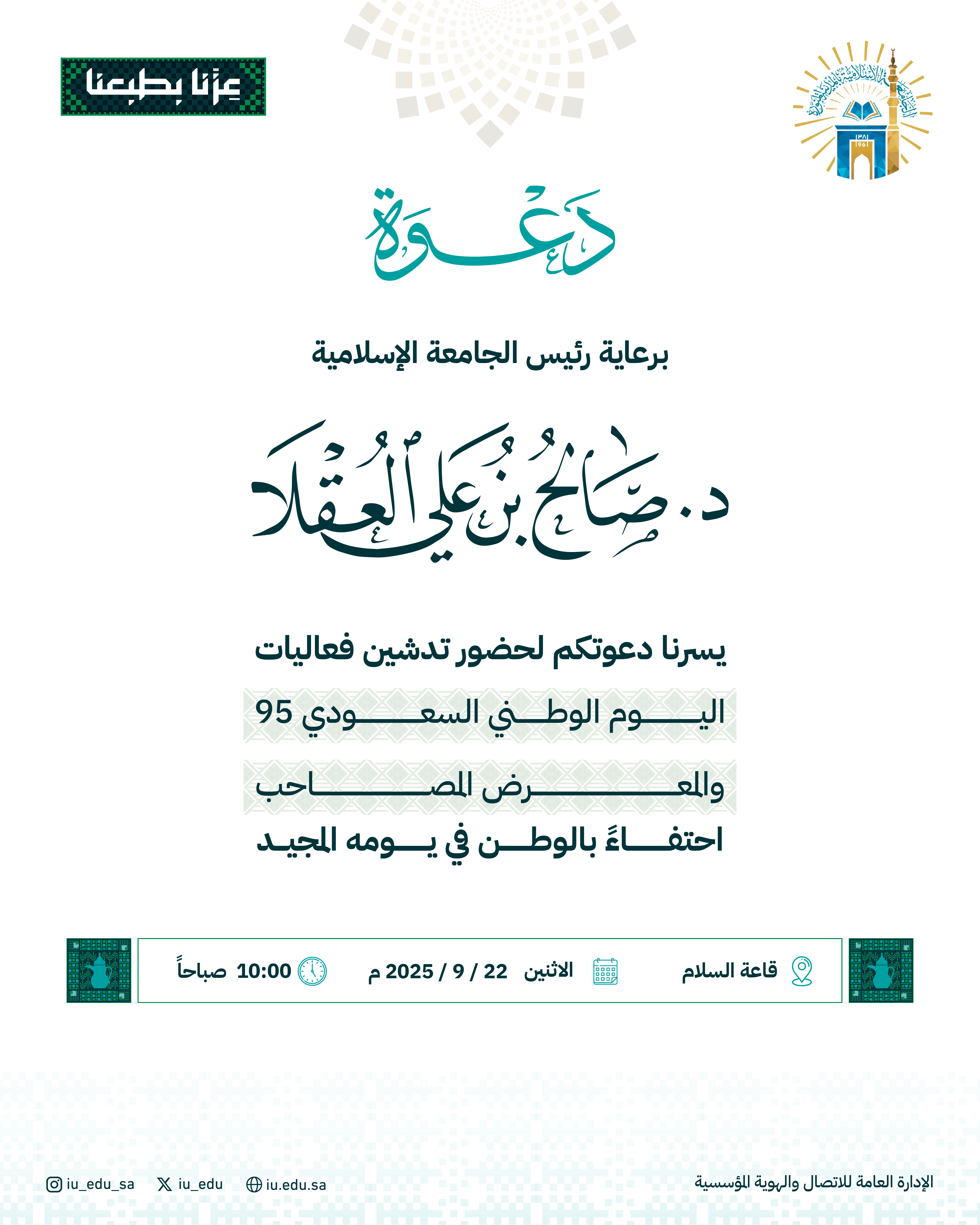 برعاية رئيس الجامعة الإسلامية، يسرنا دعوتكم لحضور تدشين فعاليات اليوم الوطني السعودي95 والمعرض المصاحب.