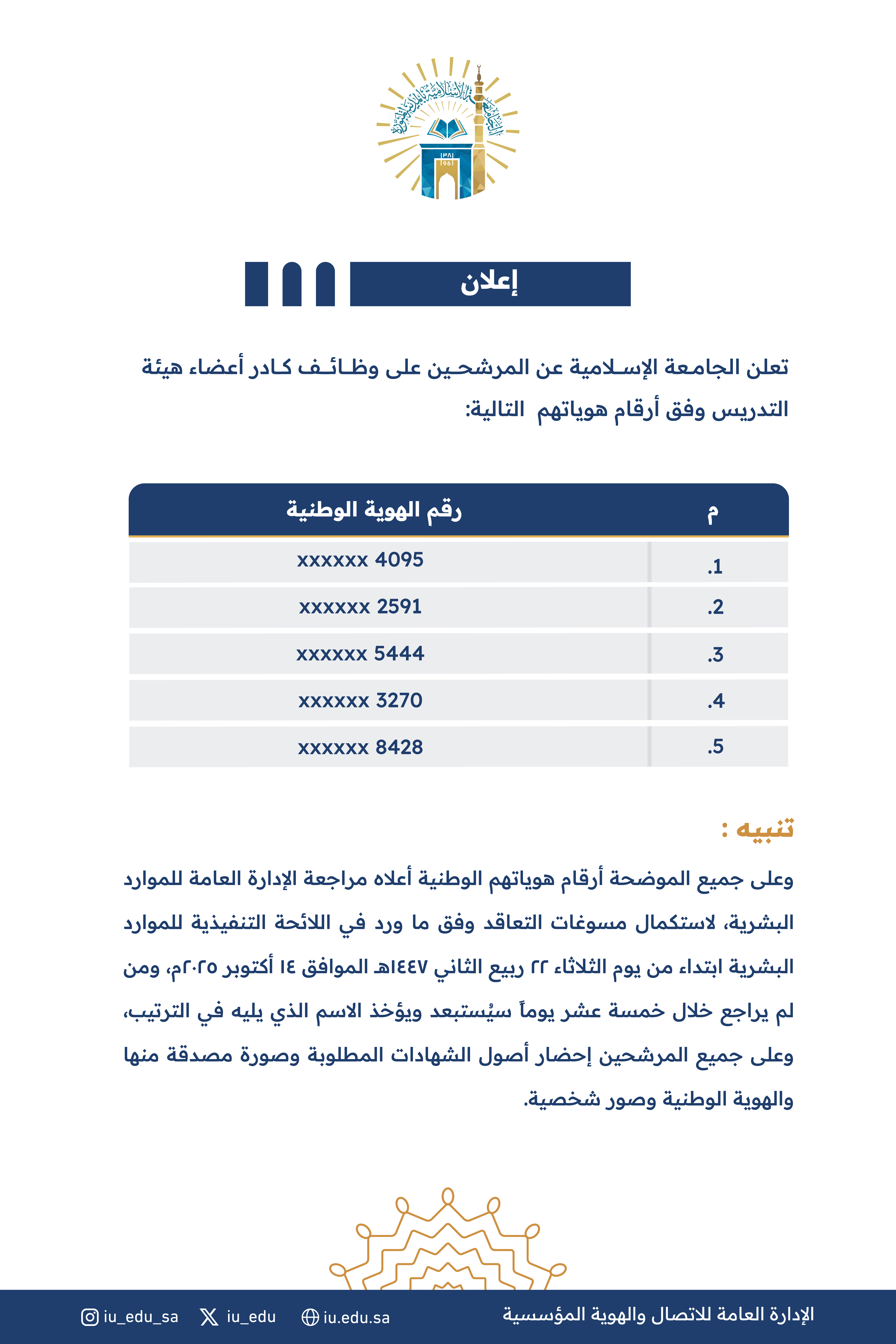 تُعلن الجامعة الإسلامية، عن المرشحين على وظائف كادر أعضاء هيئة التدريس وفق أرقام هوياتهم التالية.