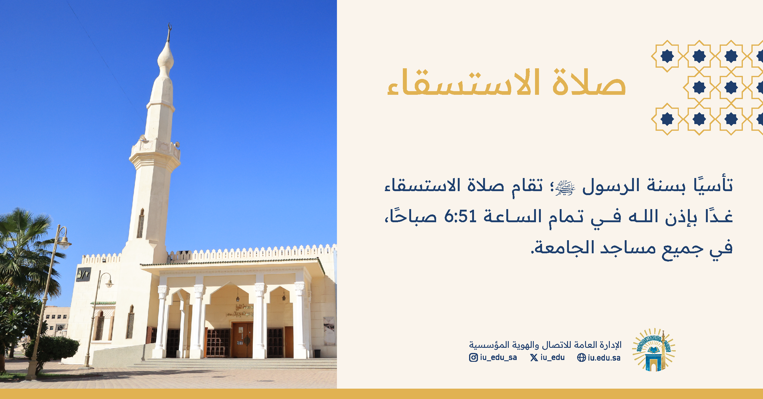 تأسياً بسنة رسولنا الكريم ﷺ، وإنفاذاً لتوجيه خادم الحرمين الشريفين -حفظه الله- تقام غدًا الخميس صلاة الاستسقاء بإذن الله في الجامعة الإسلامية، الساعة 6:51 صباحًا.