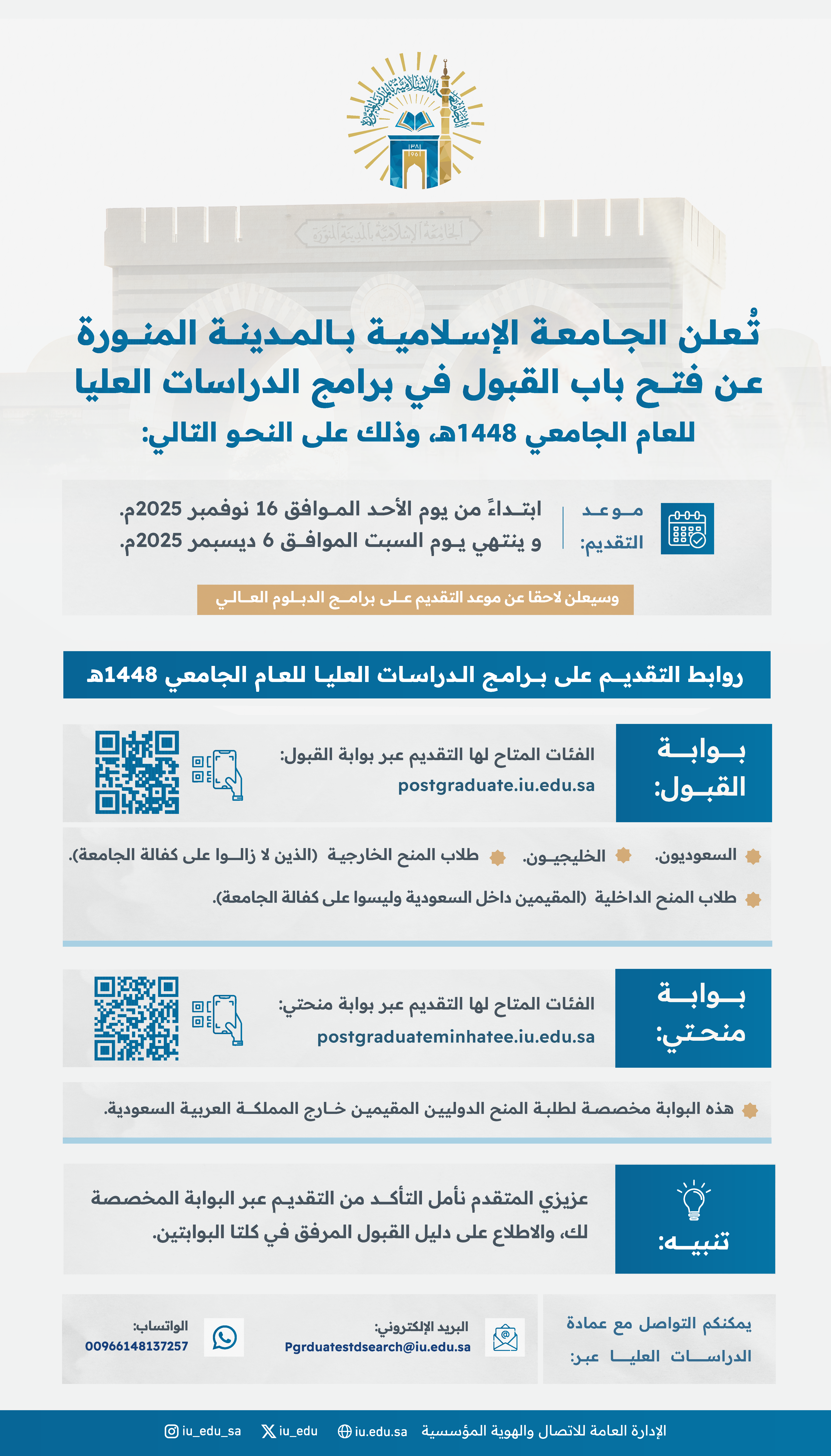 تعلن الجامعة الإسلامية عن فتح باب القبول في برامج الدراسات العليا للعام الجامعي 1448هـ