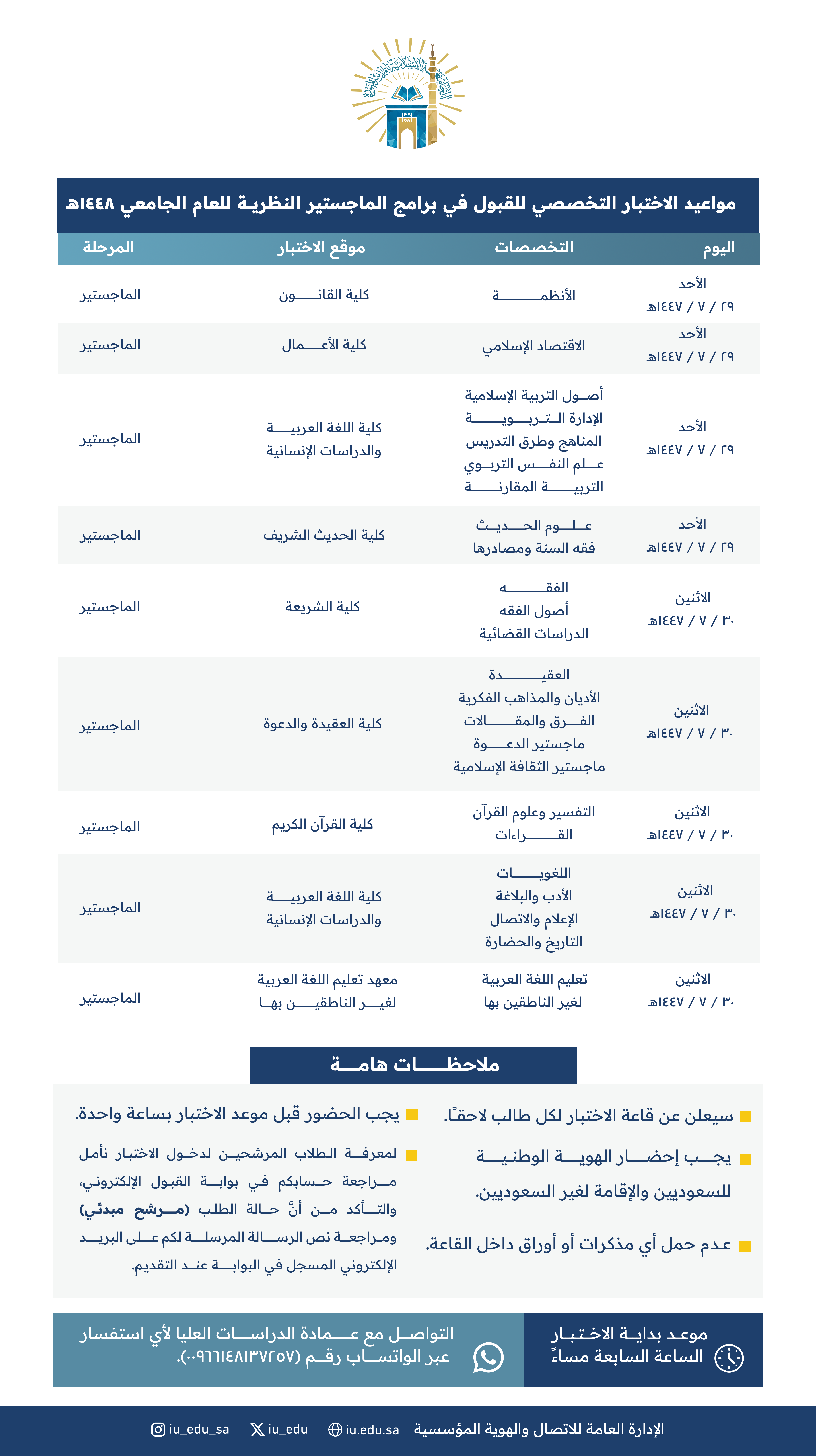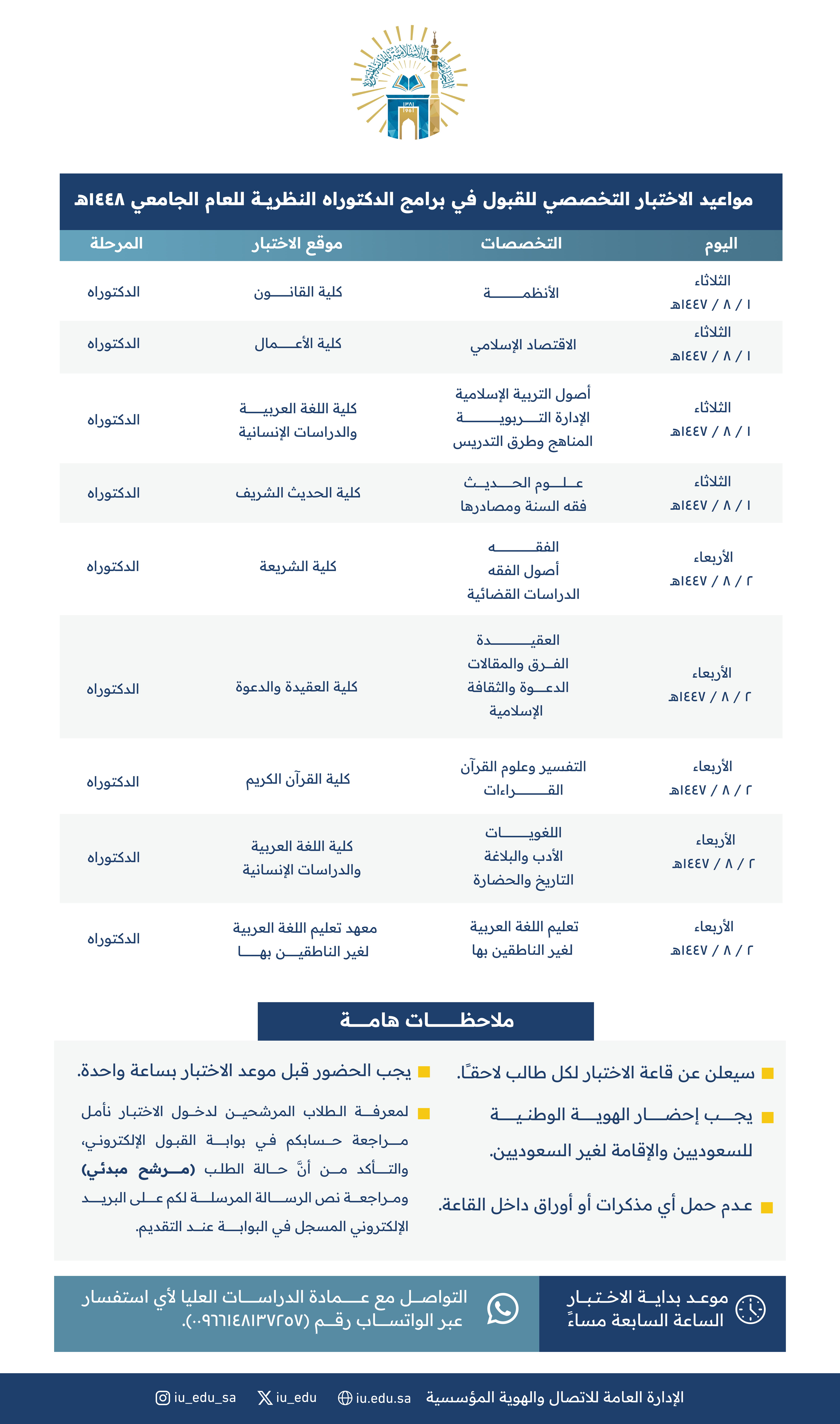 تعلن عمادة الدراسات العليا بـ #الجامعة_الإسلامية عن جدول مواعيد الاختبار التخصصي للقبول في برامج الماجستير والدكتوراه النظرية، وفق البيانات التالية.