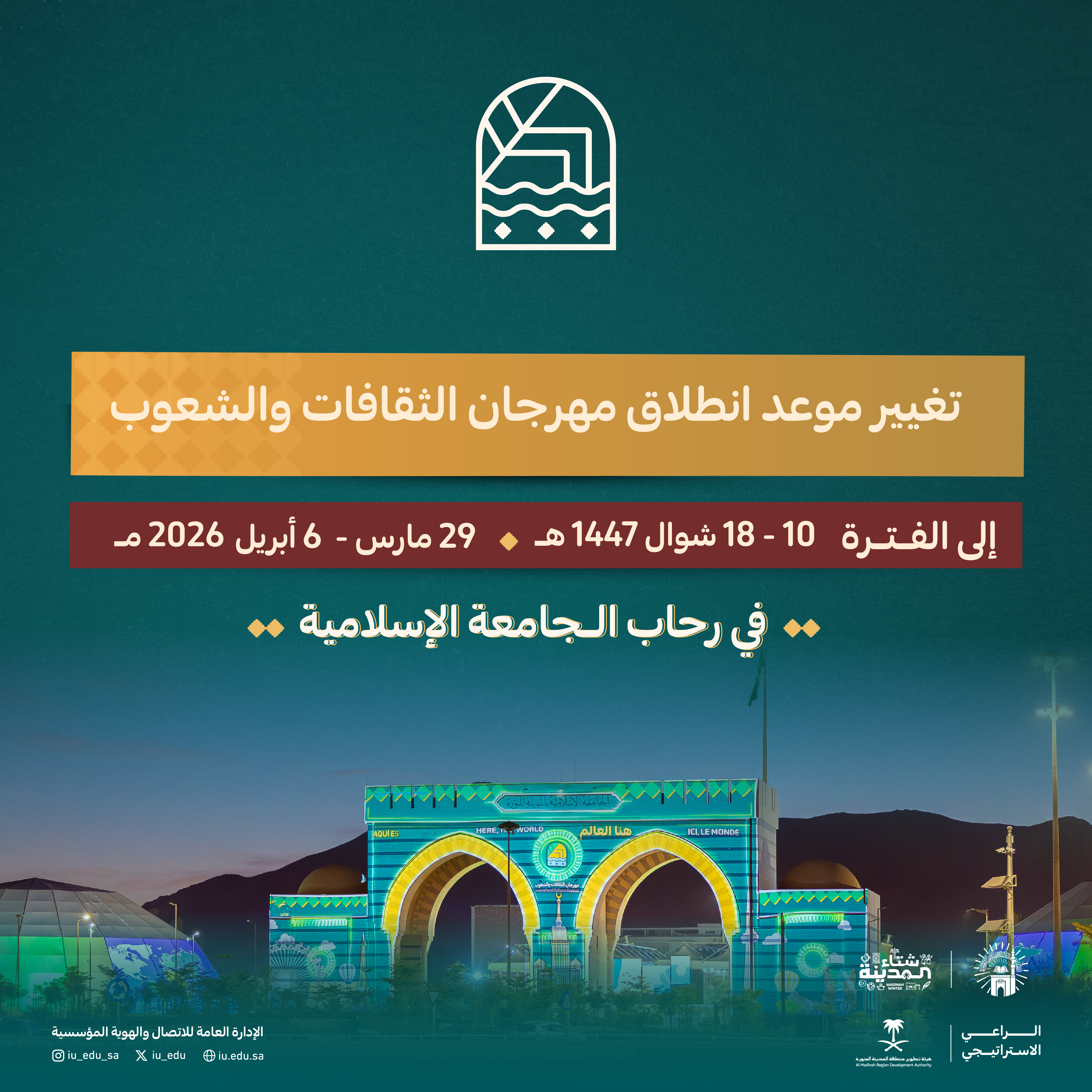 تعلن الجامعة الإسلامية عن تغيير موعد مهرجان الثقافات والشعوب في نسخته الرابعة عشرة