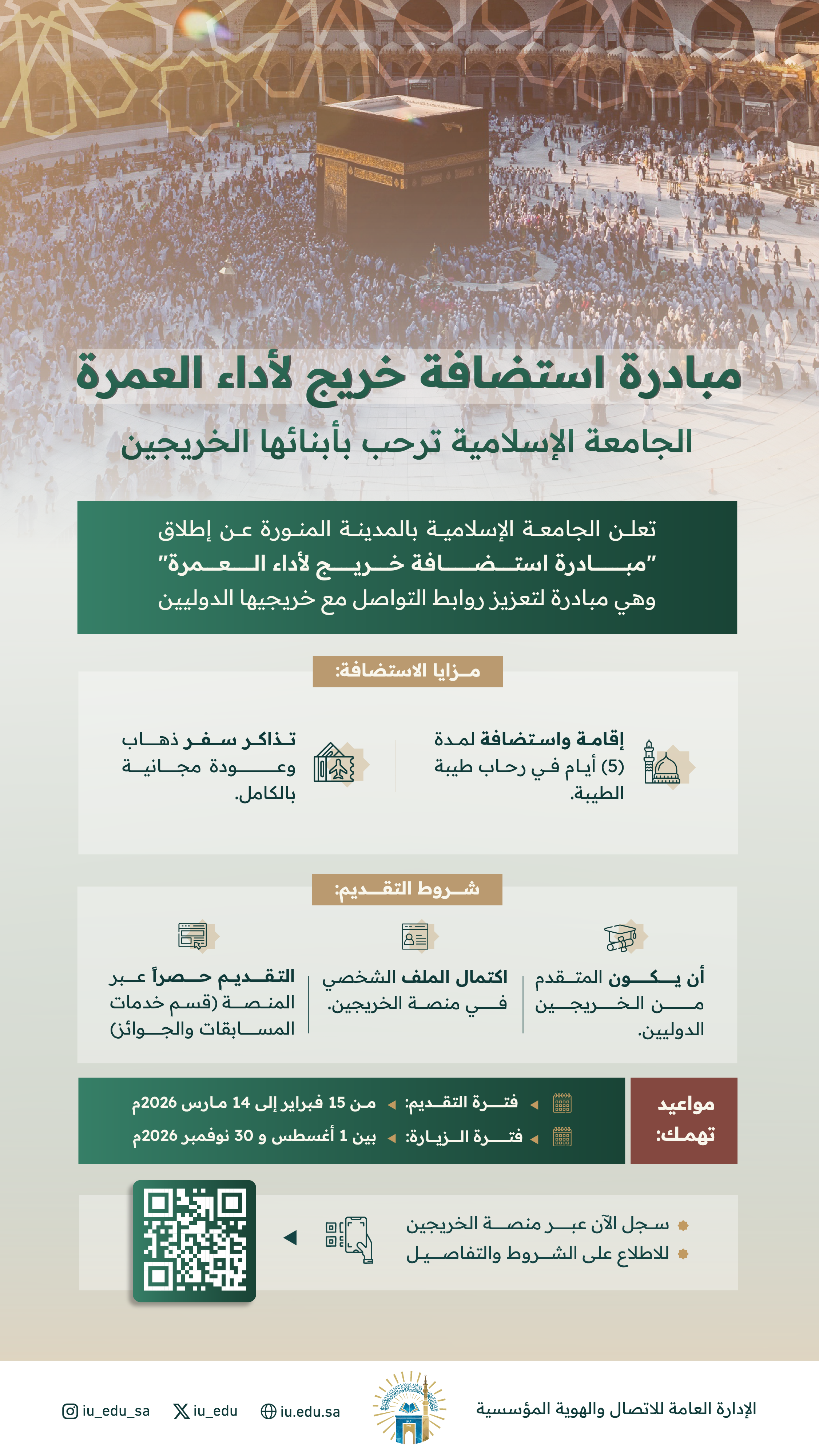 تعلن الجامعة الإسلامية عن إطلاق مبادرة استضافة خريج لأداء العمرة