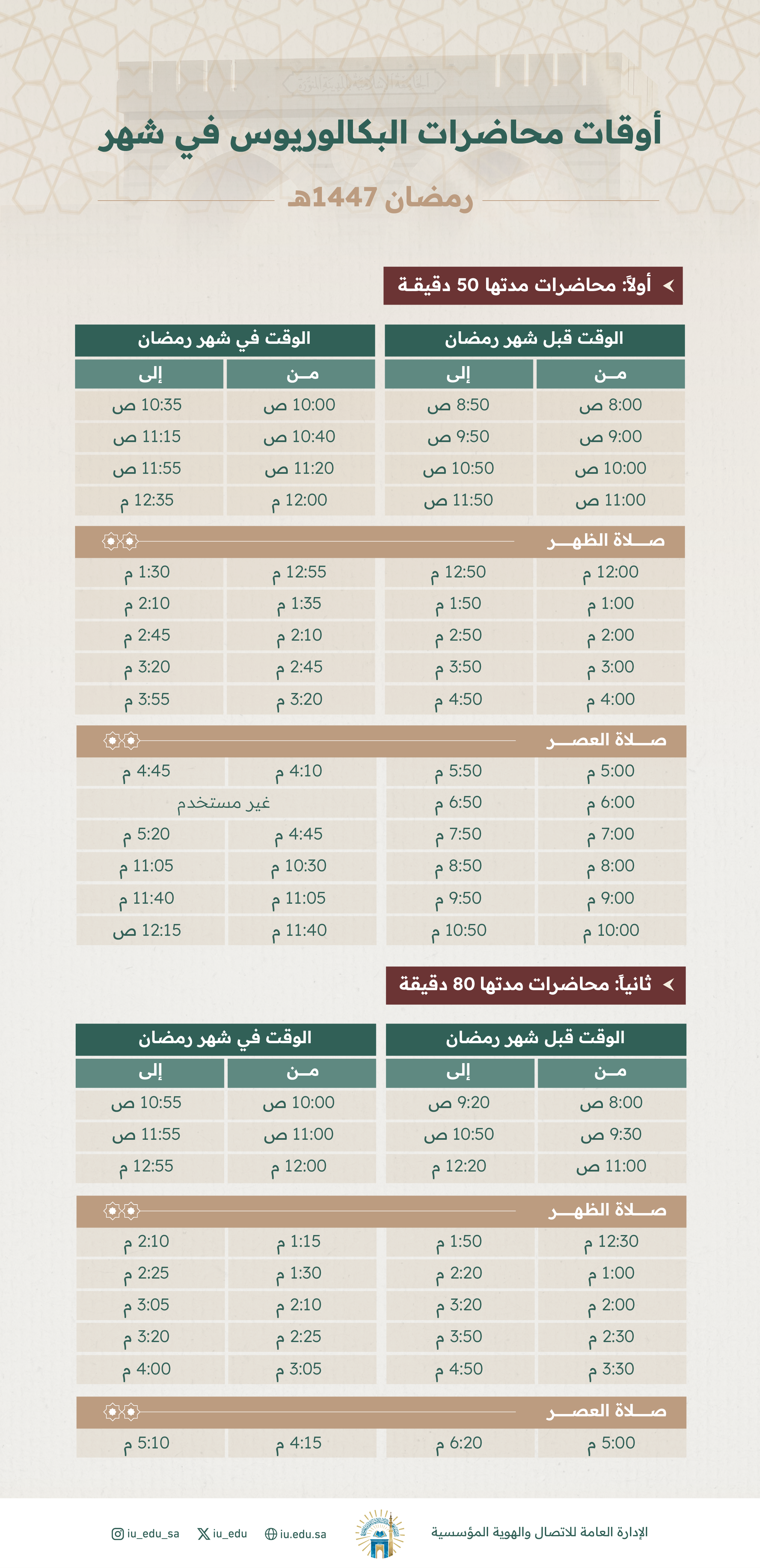 أوقات المحاضرات النظرية والعلمية والمعامل في برامج البكالوريوس (الانتظام) في شهر رمضان المبارك من العام 1447هـ.