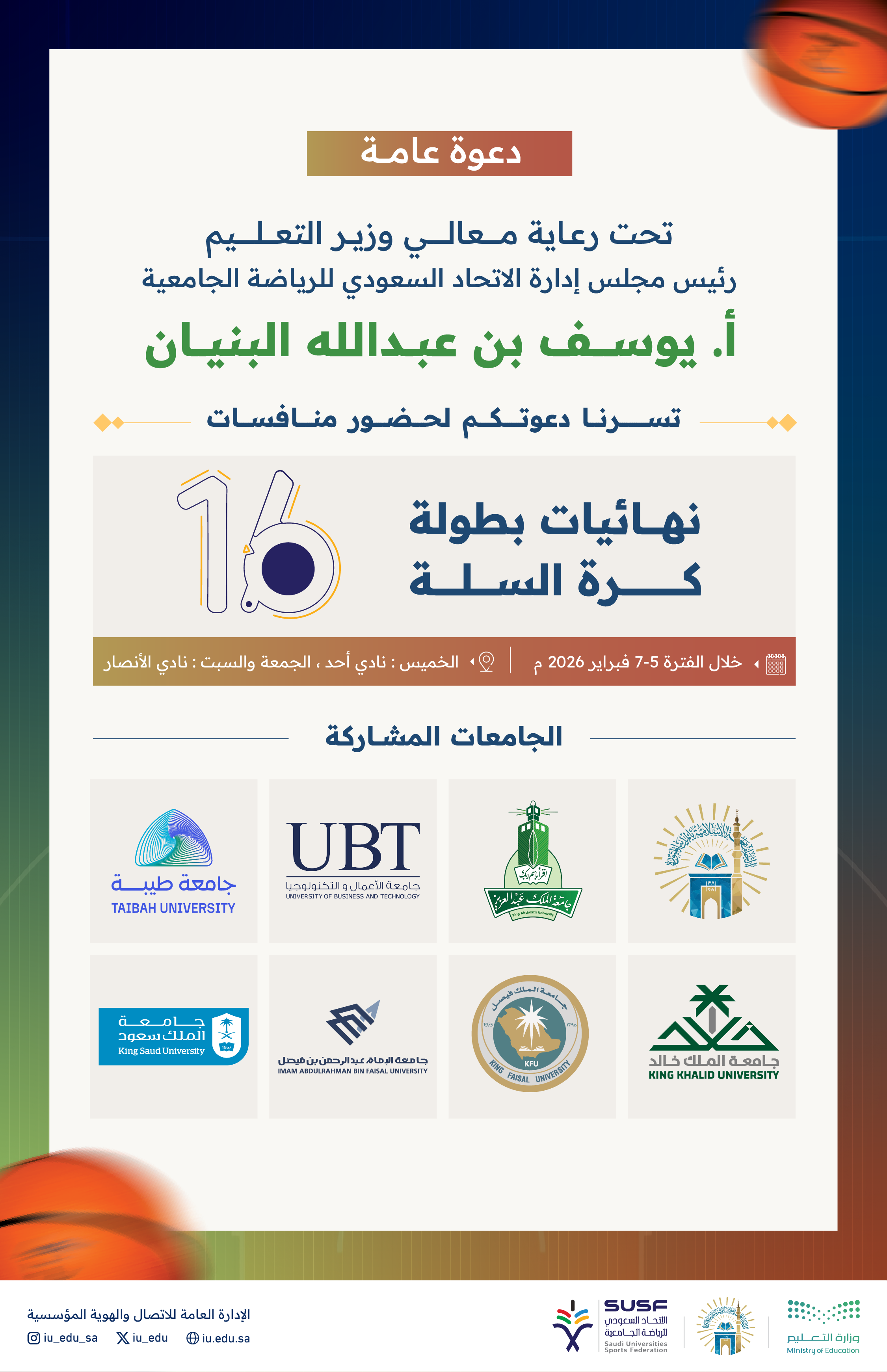 الجامعةالإسلامية تستضيف نهائيات بطولة كرة السلة لمنتخبات الجامعات السعودية، بمشاركة ثمانية منتخبات جامعية