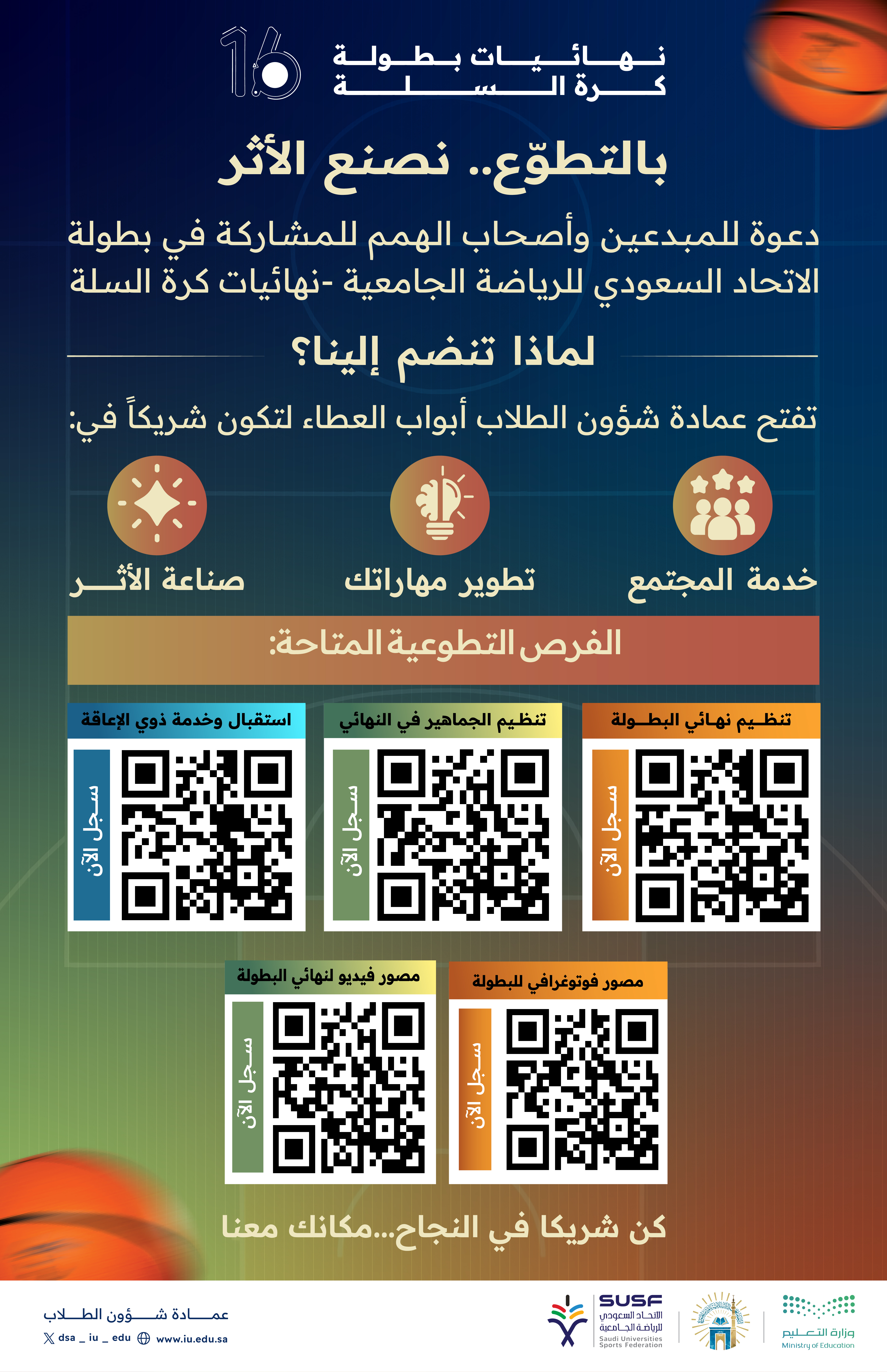 يسرّ عمادة شؤون الطلاب دعوة طلابها من أصحاب المهارات والخبرات للمشاركة في الفرص التطوعية المتاحة، والمساهمة في صناعة أثر مجتمعي فاعل، من خلال مجالات تطوعية متنوعة تشمل الجوانب التنظيمية، والمهارية، والاحترافية، بما يخدم المجتمع المدني ويعزز قيم العطاء والمسؤولية.