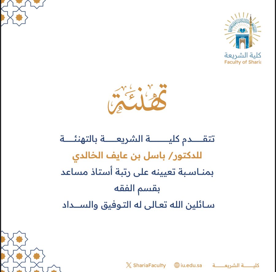 #تهنئة تتقدم #كلية_الشريعة بتهنئة سعادة الدكتور (باسل بن عايف الخالدي) بمناسبة تعيينه على رتبة أستاذ مساعد ،، سائلين الله له التوفيق والسداد،،